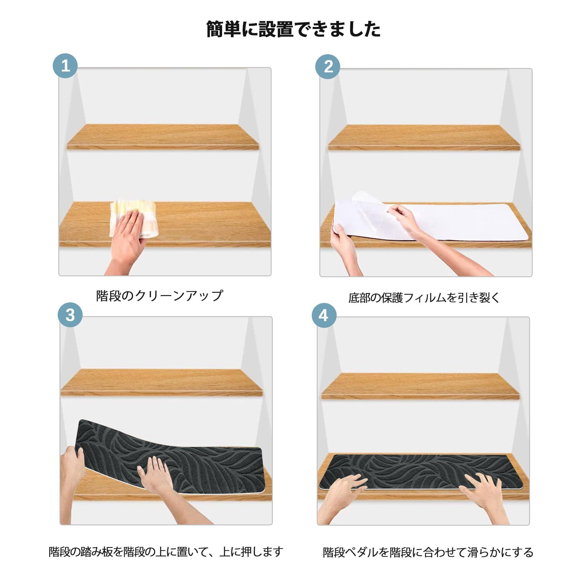 【完璧なサイズ】滑り止めおしゃれな階段マット、サイズは約76x 20 cmで、室内、屋外、学校、工場、公共の床など様々な場所に適用でき、素材は長さや角度に合わせてカットできます。取り付けが簡単です。 階段防音シートの表面は柔らかいポリエステルで作られており、足に優しいです。 裏面はしっかりフィットし、吸音効果の高いポリエステル素材が焦げ付きにくい足音を軽減。