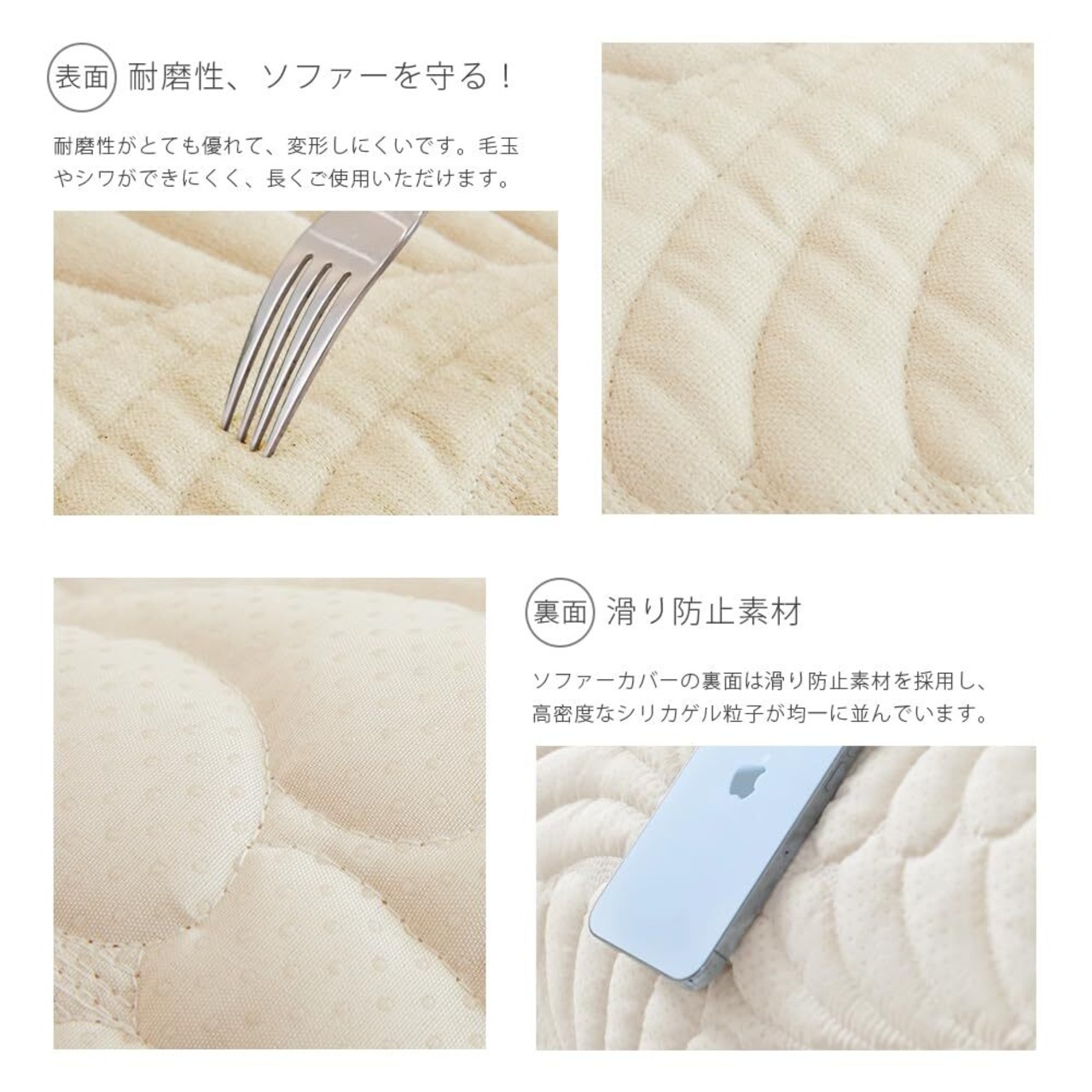 【滑り防止デザイン】ソファーカバーの裏面は滑り防止素材を採用し、高密度なシリカゲル粒子が均一に並んでいます。耐磨性がとても優れて、変形しにくいです。不規則な縁取り線のデザイン、おしゃれな雰囲気でありながら通常の設計よりもっとしっかりしていて、耐用性UP!内層は綿充填、柔らかくて縮みや型崩れなし、毛玉やシワができにくく、長くご使用いただけます。
