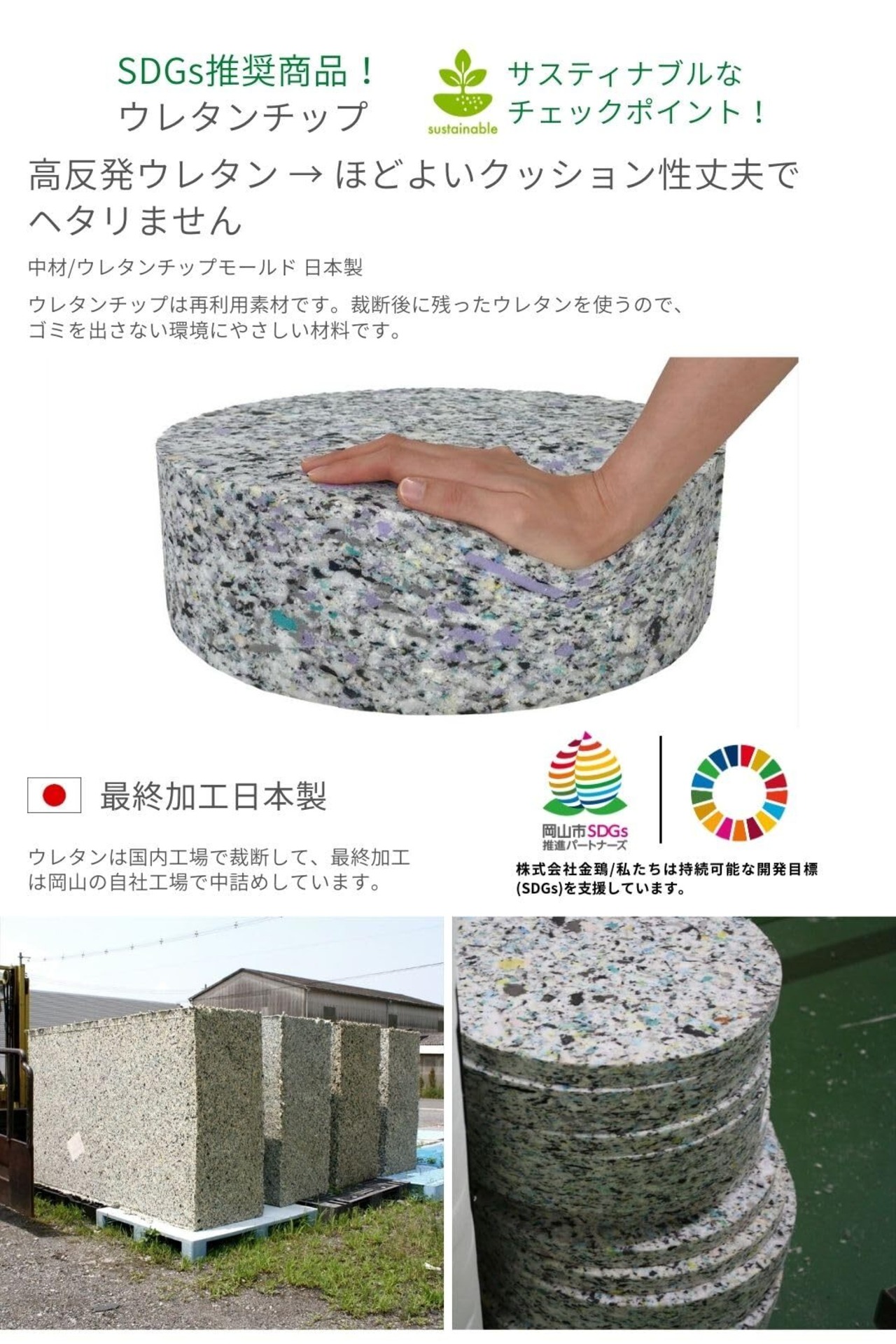 サスティナブルな取り組み/ウレタンチップは再利用素材です。裁断後に残ったウレタンを使うので、ゴミを出さない環境にやさしい材料です。