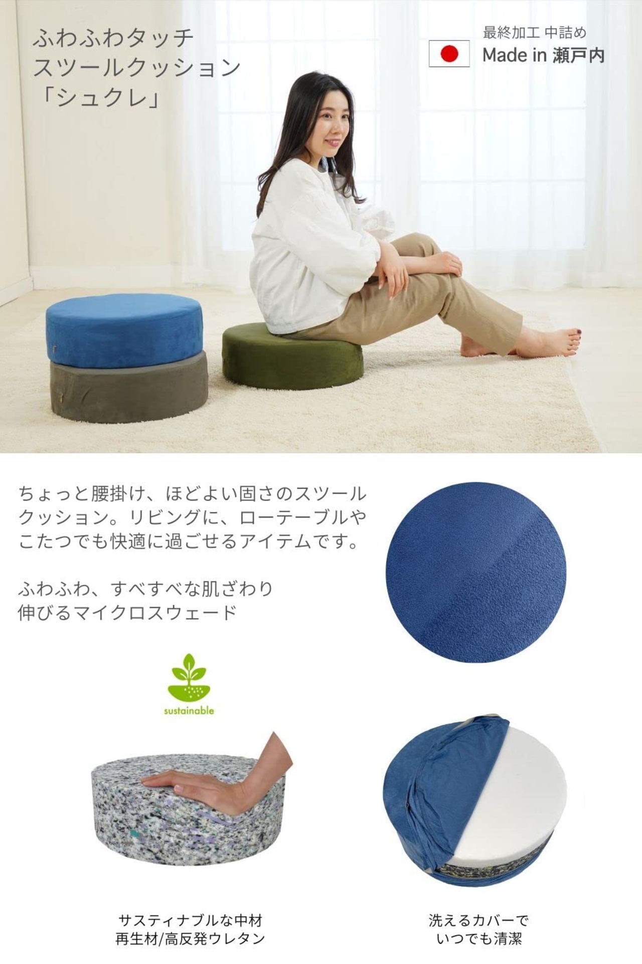 ちょっと腰掛け、ほどよい固さのスツールクッション。リビングや、ローテーブルやこたつでも快適に過ごせるアイテムです。スツールクッション直径40×12cm