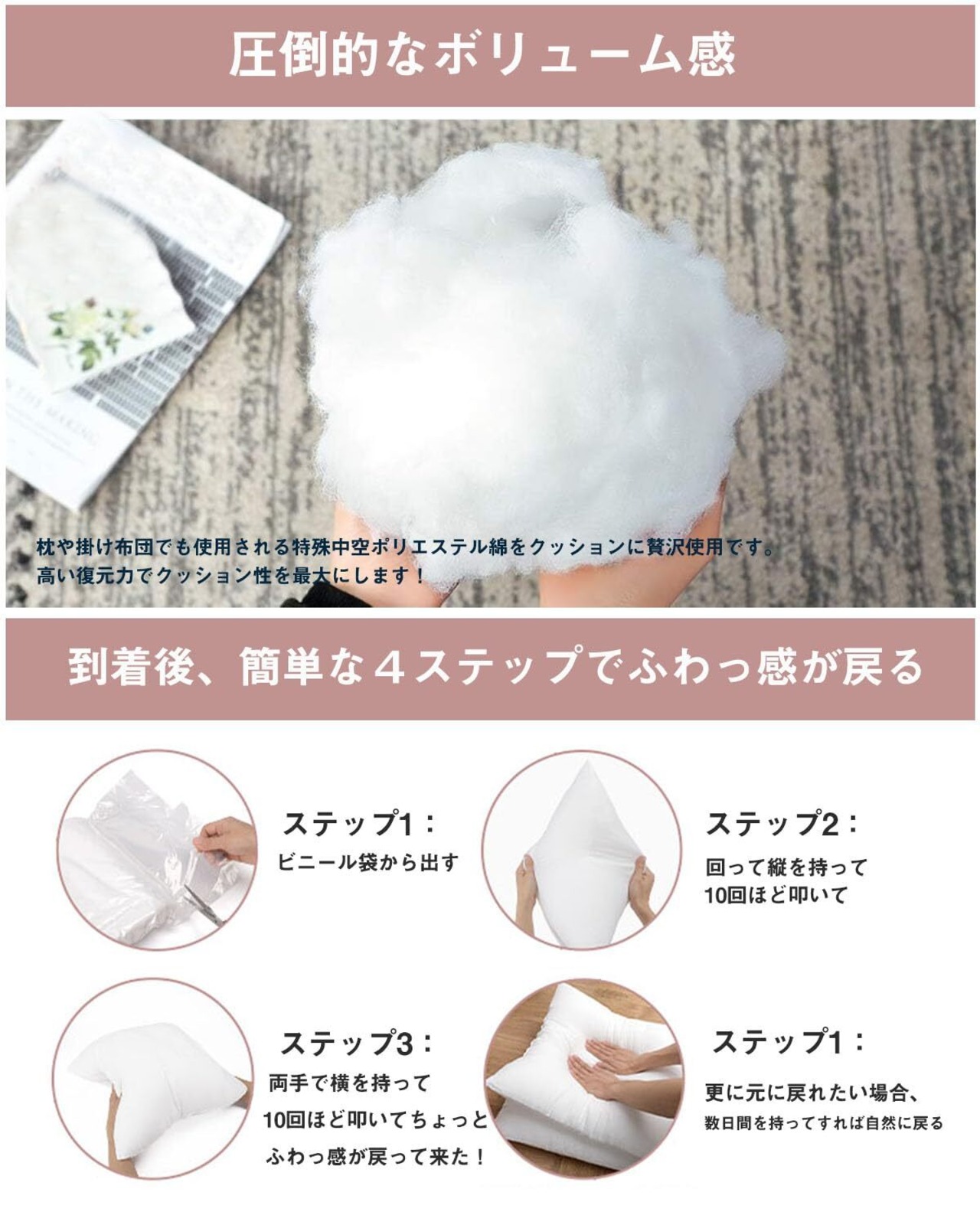 「圧縮加工で衛生的」 詰めたてを真空パックいたしますので、虫やゴミなどの混入の心配がなく衛生的です。袋から取り出せば、すぐにご使用になれます。商品開封後、袋から取り出して、横を中央に向かってパンパンと数回たたいてください。縦も同じように数回たたいて形を整えてください。ふんわり、膨らみ、いつまでもソフトなクッションが出来上がります。