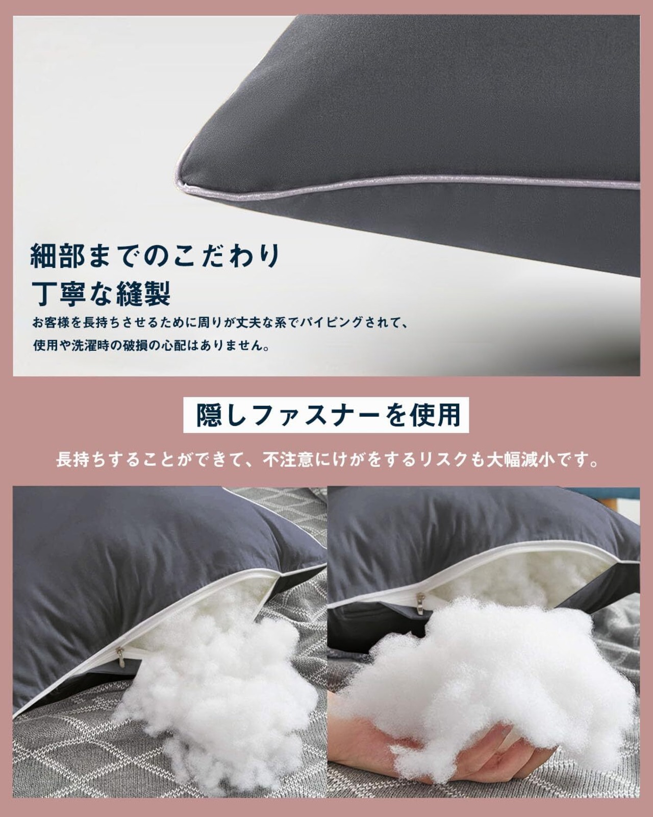 「ホテル級!ふんわり気持ちいい」 素材がポリエステル100%で、通気性と吸湿性が優れて、肌に優しい敏感肌にも大丈夫です。グーッと沈みこむようなしっかりとした弾力があり、寄りかかった時に安定感があります。座布団として使っても、従来のクッションより底付き感がないので、お尻が痛くならないと感じる方も多くいます。長期間使用しても型崩れが起きにくいです。*商品には個体差があります。複数個ご注文いただく場合は、ボリューム感やにおいなどにそれぞれ違いがある可能性がございますことを、あらかじめご了承くださいませ。