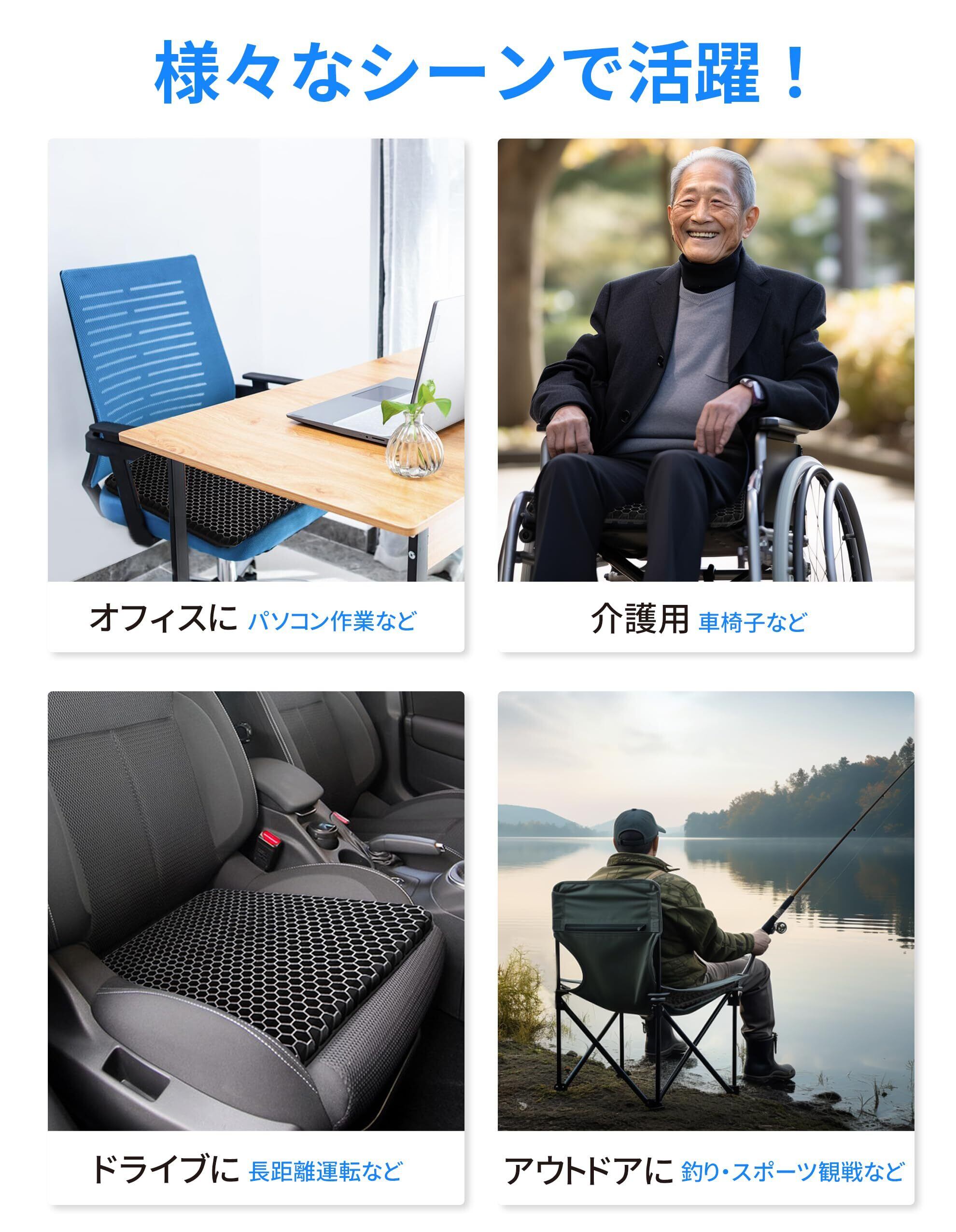 【どこもクッション・どこも使える】オフィスはもちろん、勉強、運転、ゲーミング用やアウトドアなどさまざまなシーンに適しています。子供から大人まで幅広い年齢層の方にお使い頂けるゲル座布団です。