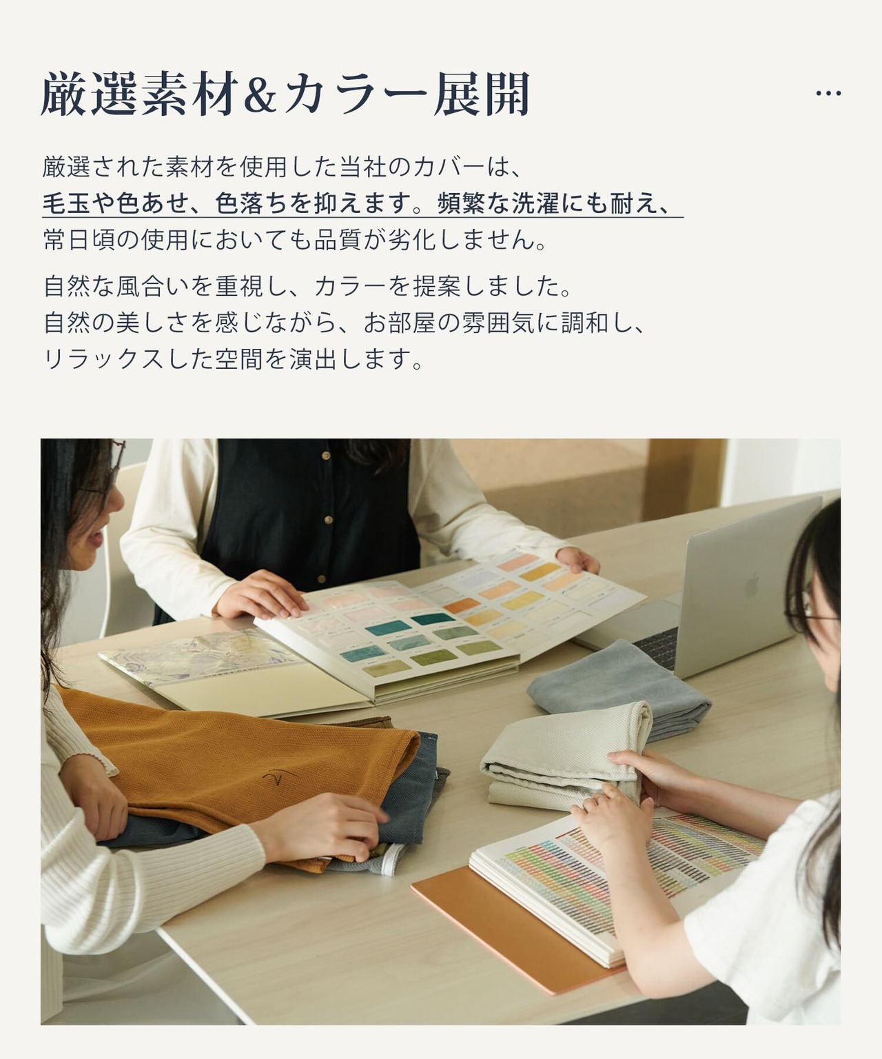 「スッキリしたデザイン」目立ちにくい隠しファスナーを採用し、シンプルでスタイリッシュな仕上がりに加え、取り外しや洗濯も簡単。お手入れがしやすく、いつでも清潔に保てます。
