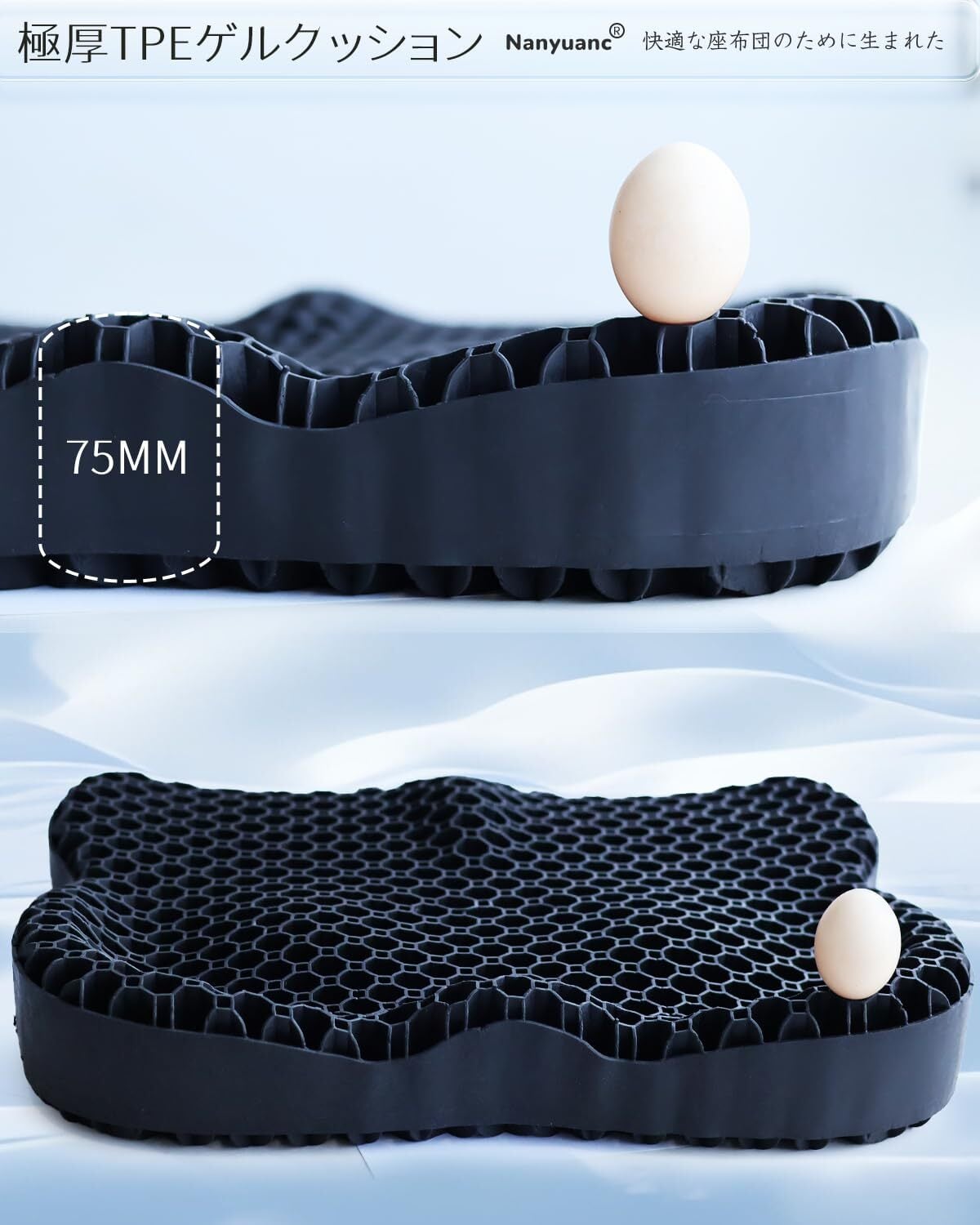 【極上の座り心地】2024自社独発 ゲルクッション 75mm極厚 無重力 クッション 座布団 ジェルクッション 体圧分散 蒸れない オフィスチェア クッション カー/車椅子/自宅/在宅勤務/テレワーク 洗えるカバー[ブラック 43×37cm]