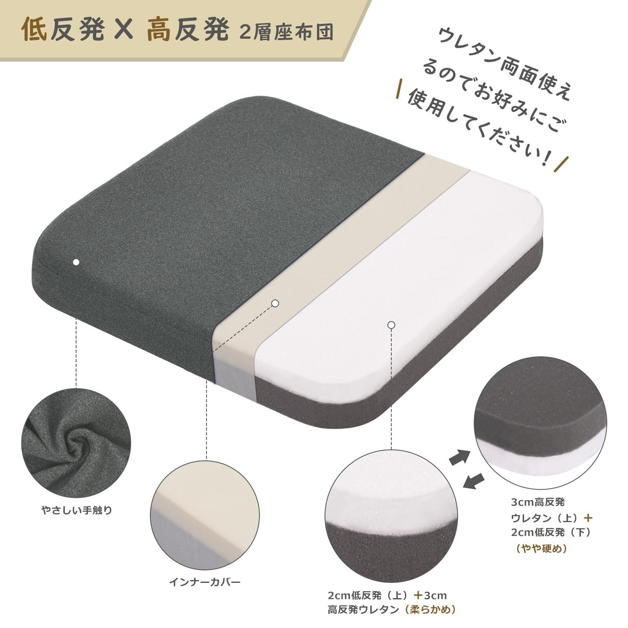 Baibu Home 座布団 クッション 低反発+高反発 椅子 ウレタン クッション 40×40×5cm 2層構造 ダークグレー カバー洗える