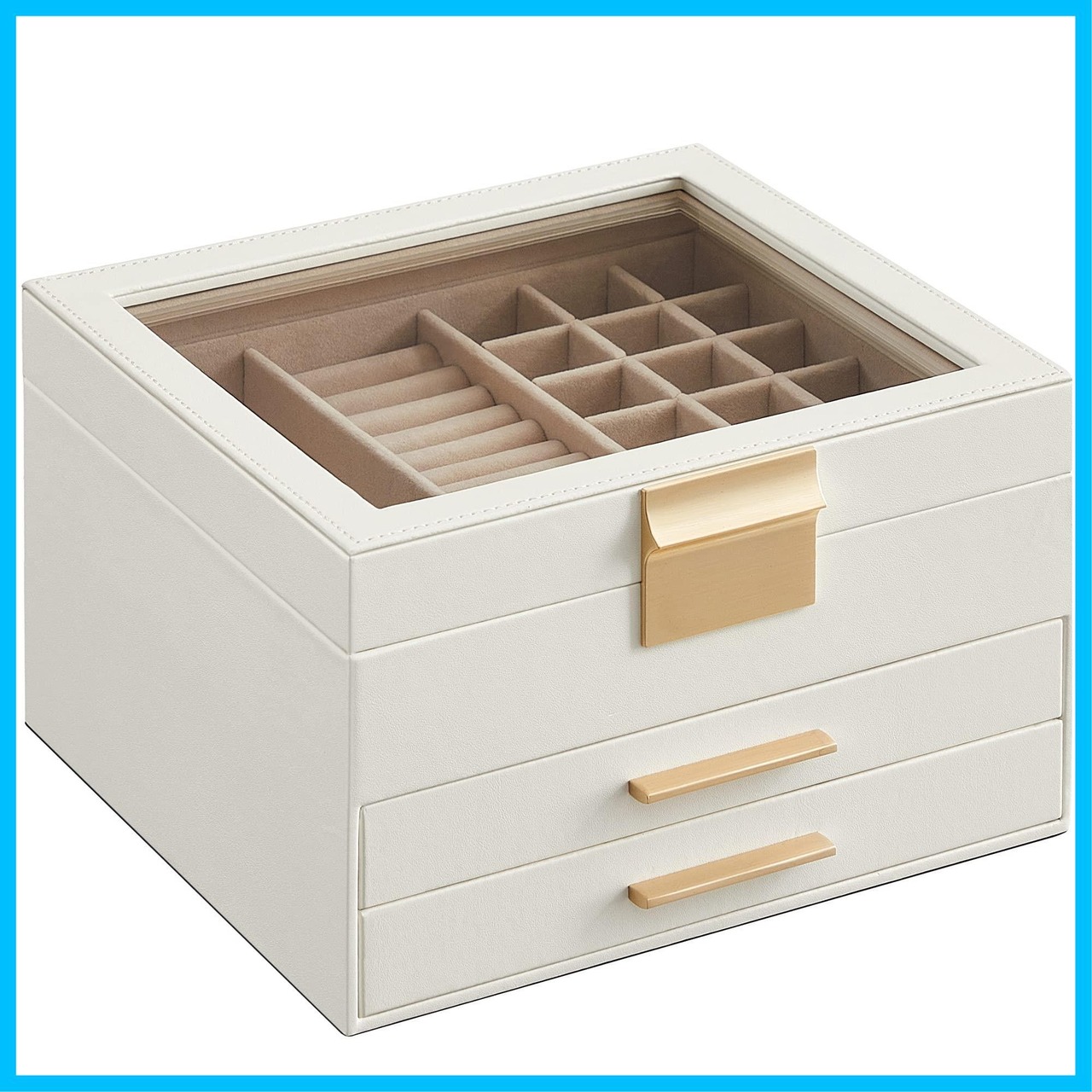 【新着商品】SONGMICS ジュエリーボックス 大容量 アクセサリーケース 3段式 引き出し ネックレス、指輪、ブレスレット収納宝石箱 ガラス蓋 ギフト ホワイト JBC239WT