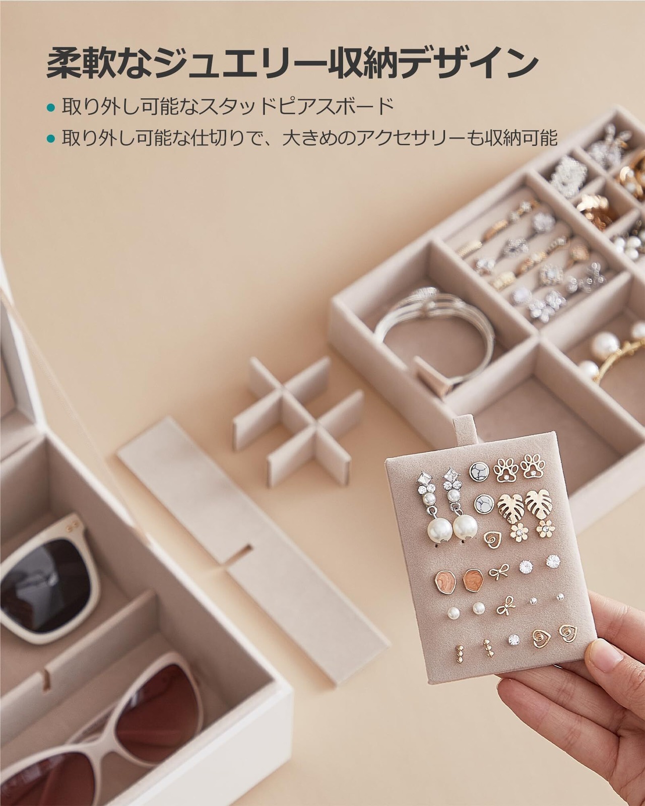 【実用的な特徴】トップトレイ、底層、ボックスの外側に使用でき、大きなアイテム用に仕切りを取り外すことができ、アクセサリーの整理が簡単。ピアスケースとしても便利です。