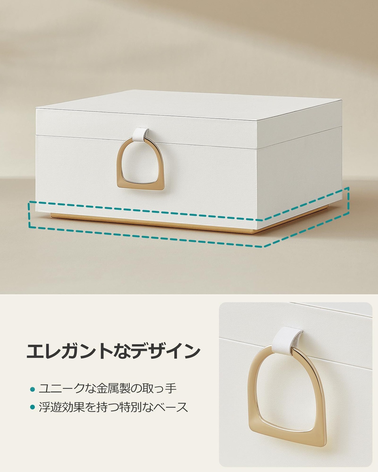 【シック&オリジナル】このジュエリーボックスはスタイリッシュでエレガント、目を引くユニークなデザインです。白とゴールドのカラーミックス、スムーズなメタルハンドルによる蓋の開閉の容易さが利便性を高めます。底部に金色の台座が付いているため、浮遊効果を演出し、さらなる魅力を引き立てます。