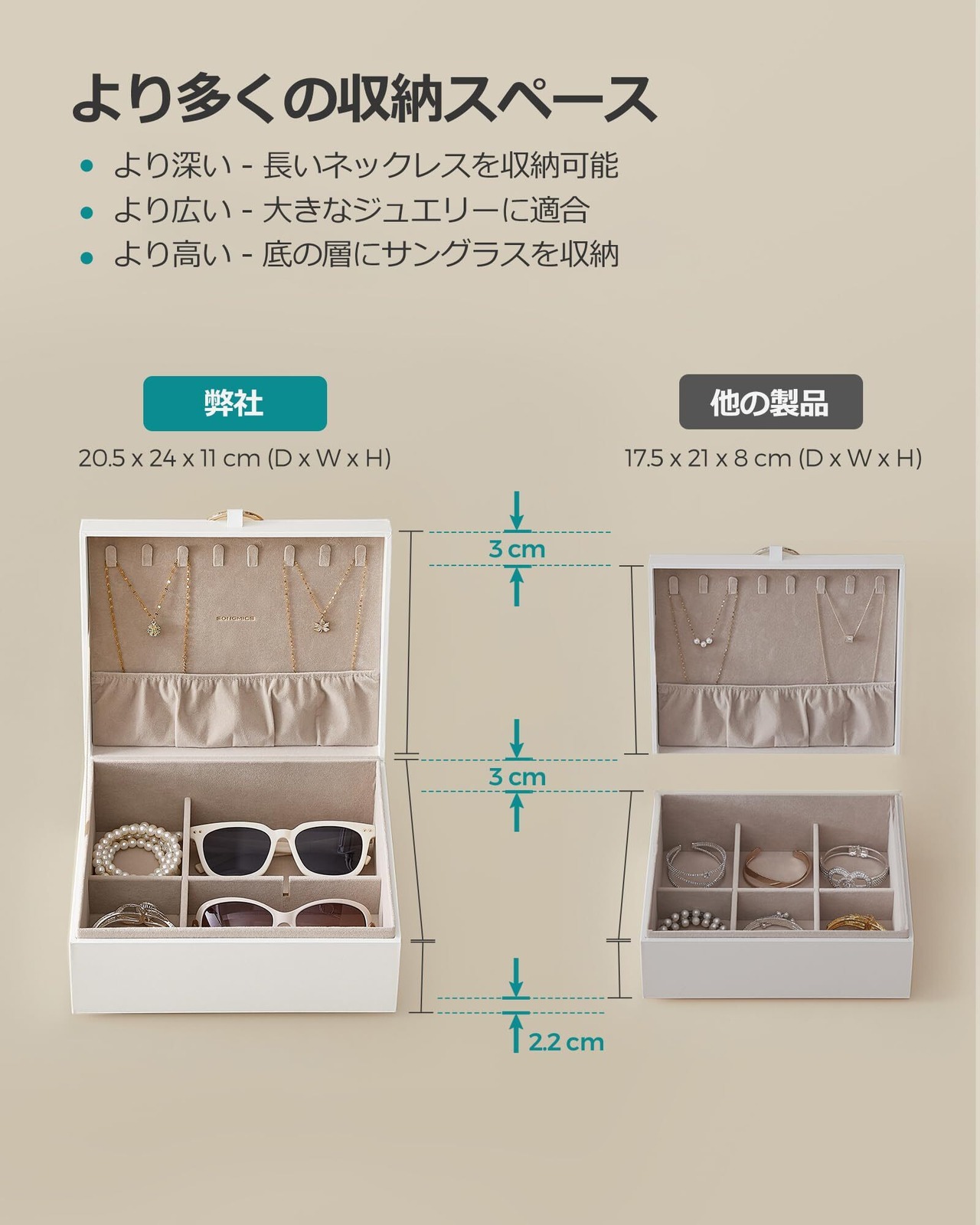 【十分な収納スペース】より大きなジュエリーケース は、宝石やアクセサリーに十分なスペースを提供します。蓋には長いネックレス用のフック、底層にはサングラス、イヤリング、スタッズ、リング、時計、ブレスレット用のさまざまなセクションがあります。ジュエリー収納に困ることはもうありません!