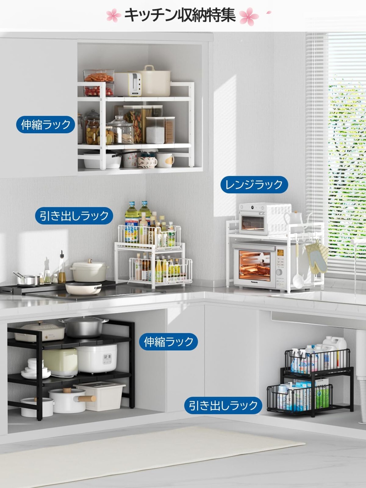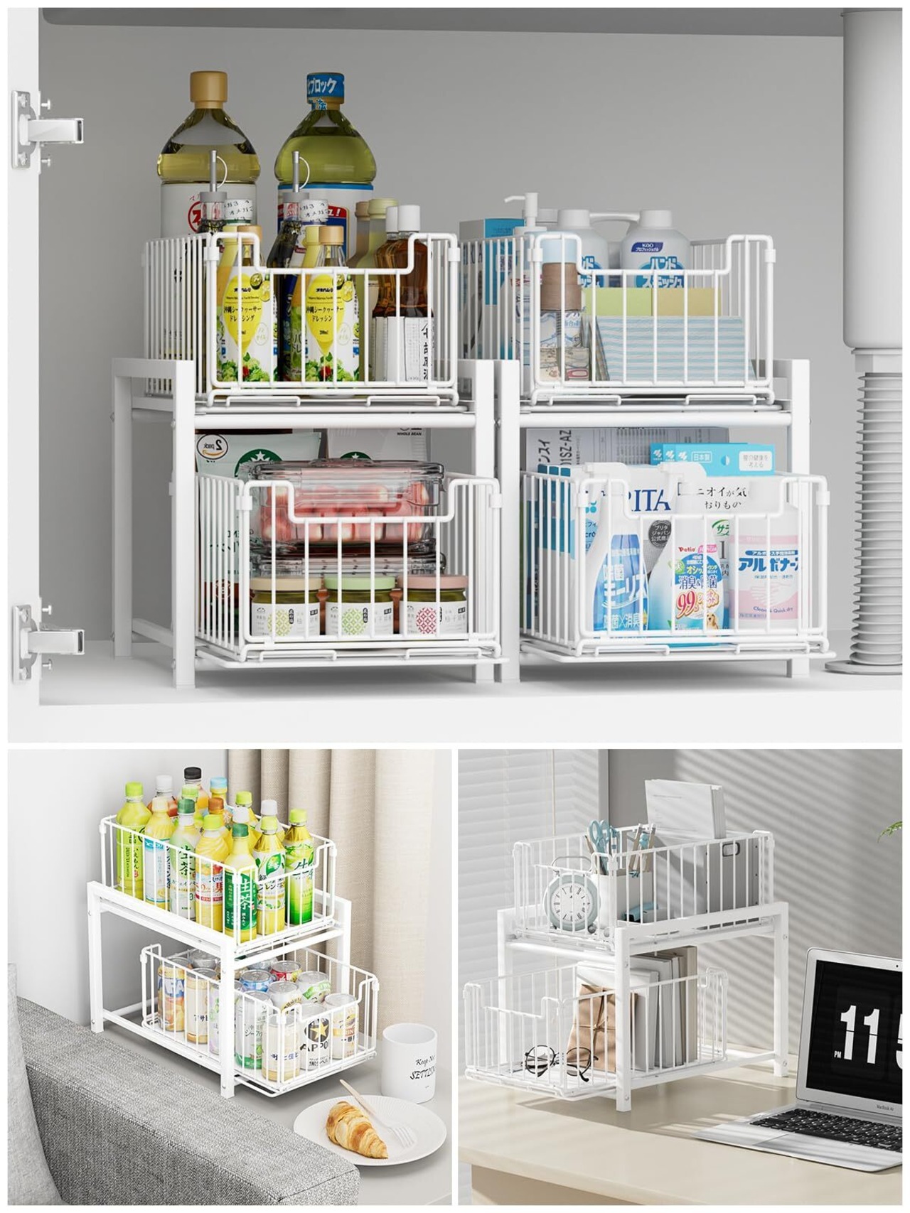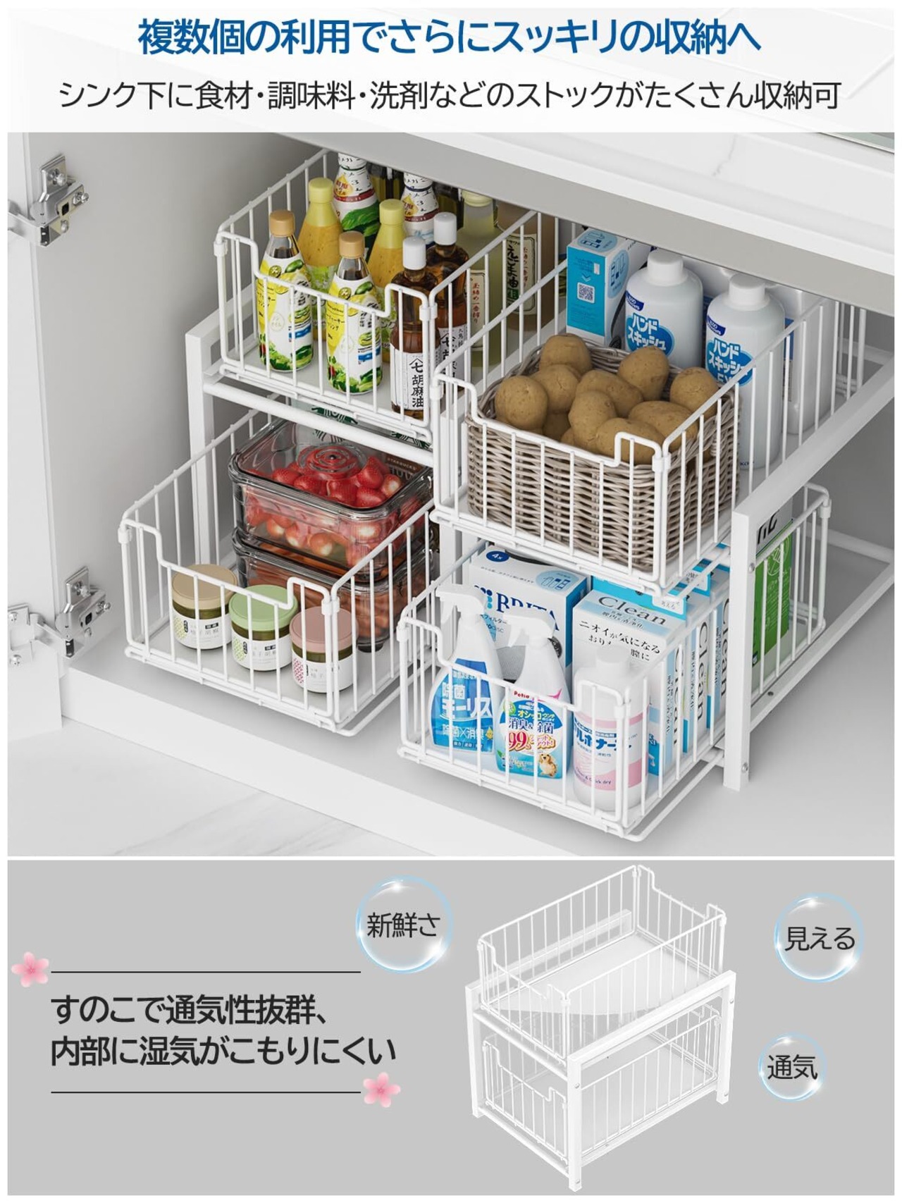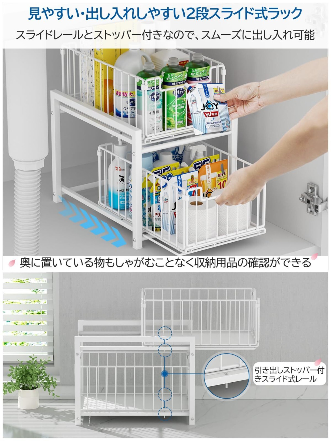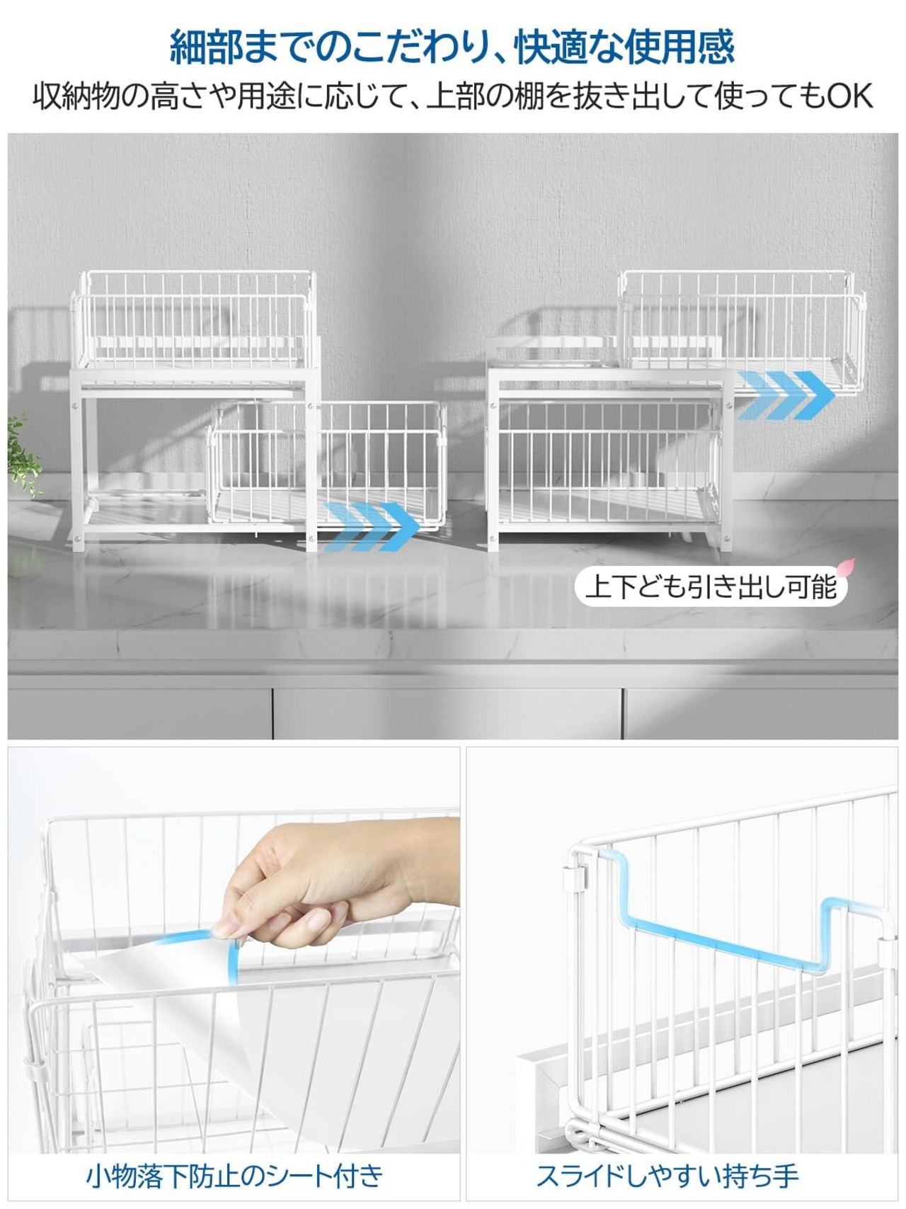 多機能ラック:シンク下はもちろん、調味料置くことも、洗面台下を置くことも、デスクの雑物や化粧品などは収納できます。奥のものが取り出しやすく、しまいやすいスライド式、スムーズに引き出せる、いろいろな場所に大活躍です。