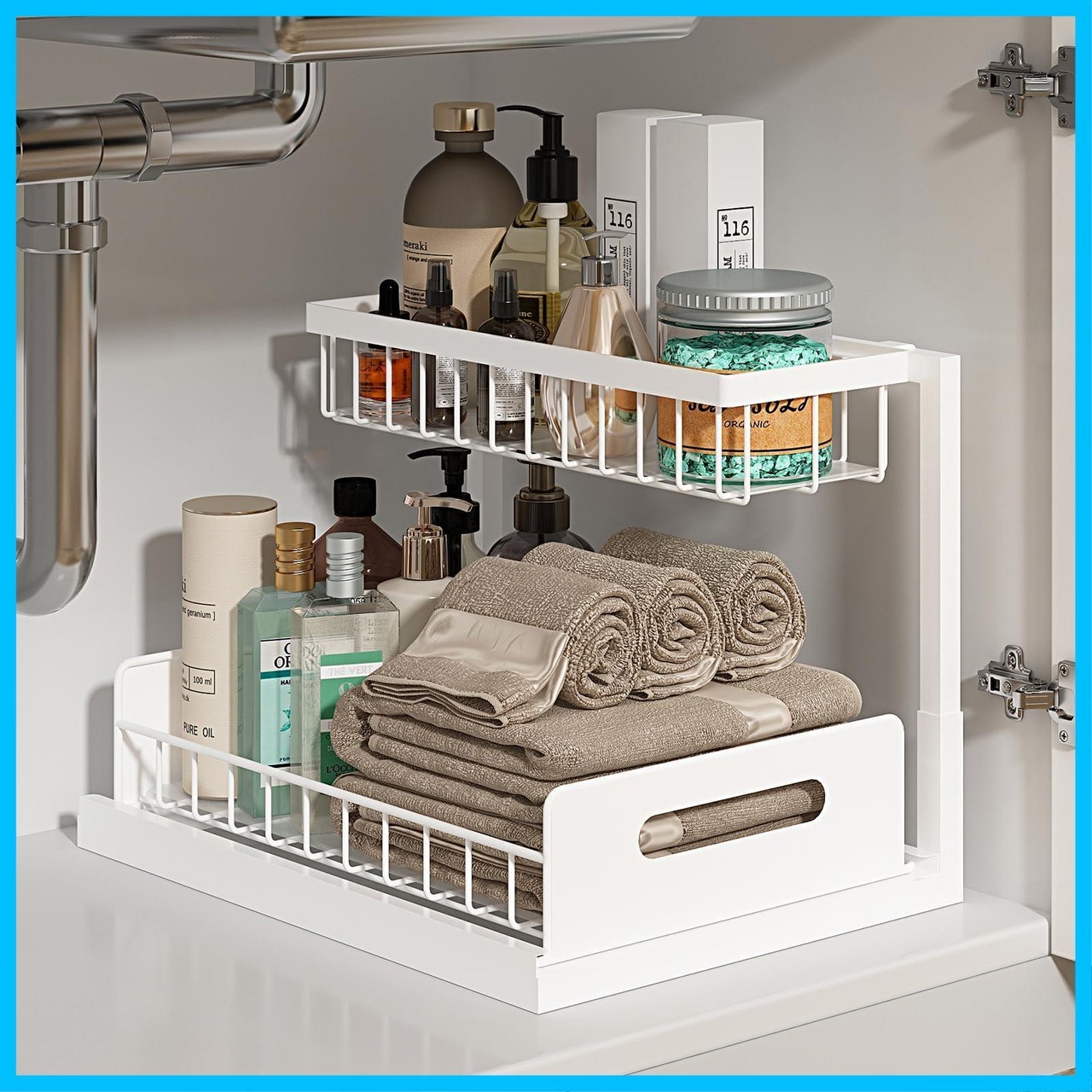 【L字型スライド式デザイン】SIUSAシンク下収納は上部が狭く、下部が広いL字型デザインで、配管のスペースを確保し、シンク下のスペースを最大限に活用します。また、下段は背の高いボトルを収納するのに適したスペースを残し、キャビネットの収納の悩みを解決することができます。