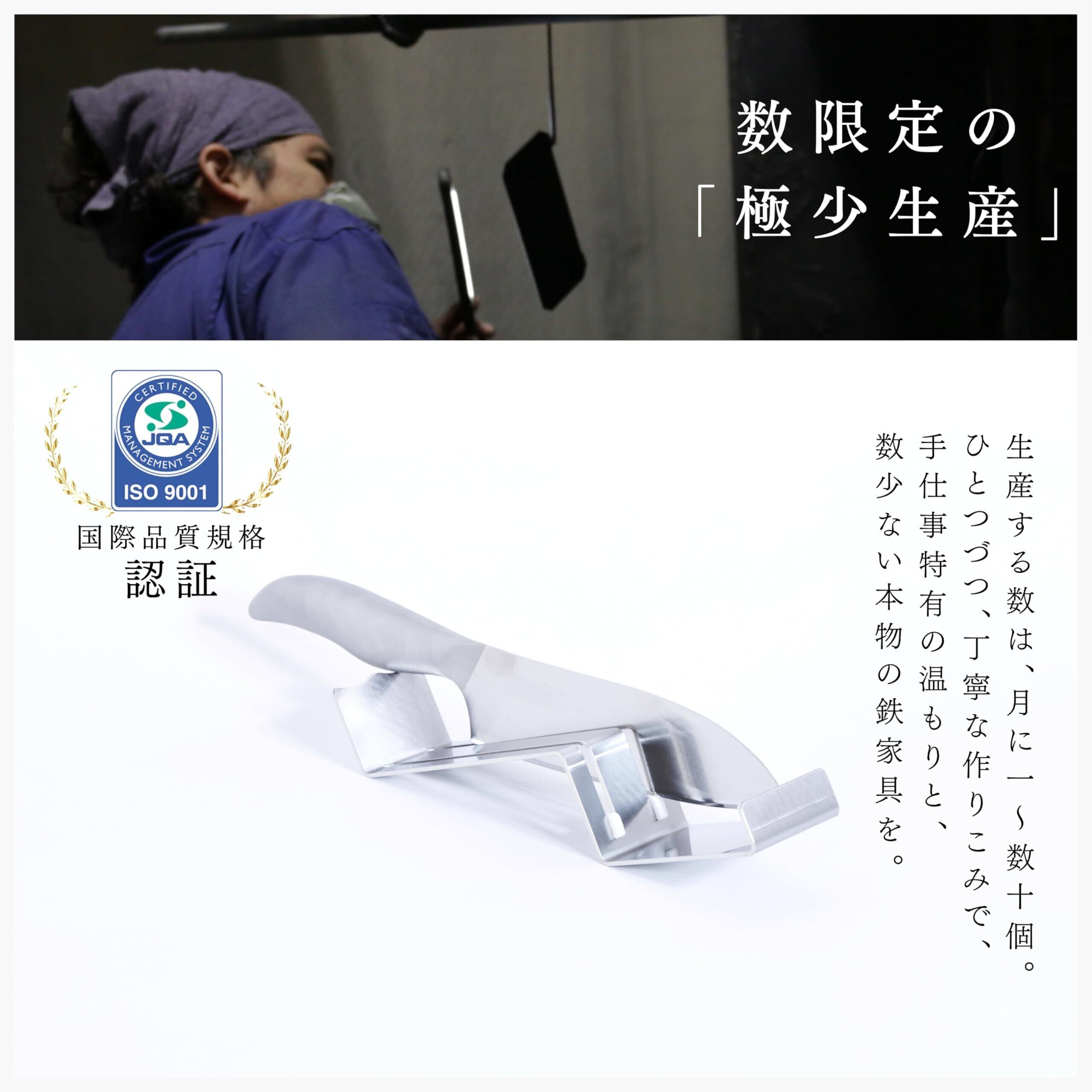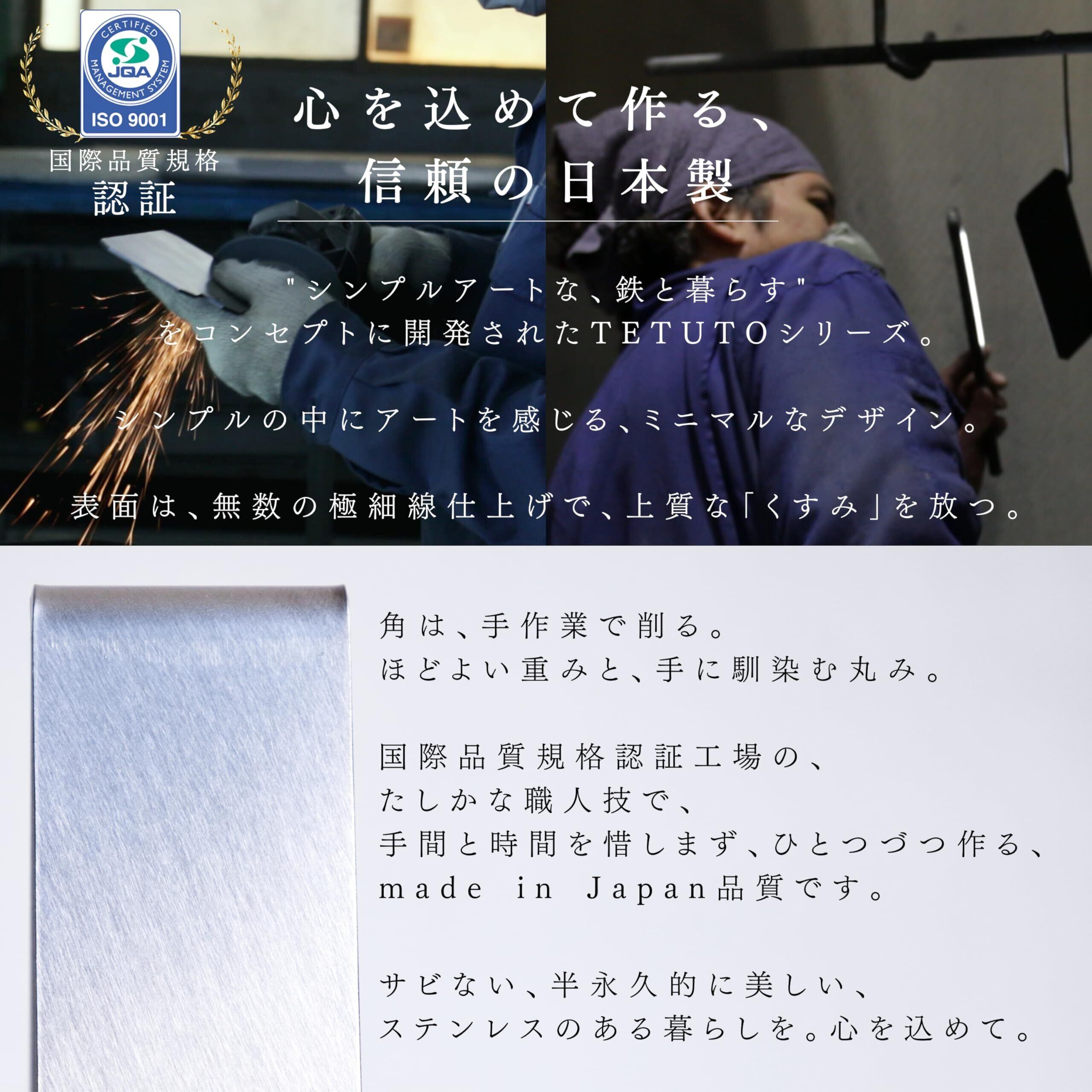 【信頼の日本製】国際品質規格認証工場のたしかな職人技で、1mm/1°以下までこだわります。無数の極細線が付くように磨き上げた表面は、落ち着きのある、上質な"くすみ"を放つ。手作業で角を丁寧に削るから、手に馴染む丸みができる。サビない、半永久的に美しい、ステンレスのある暮らしを。心を込めて。