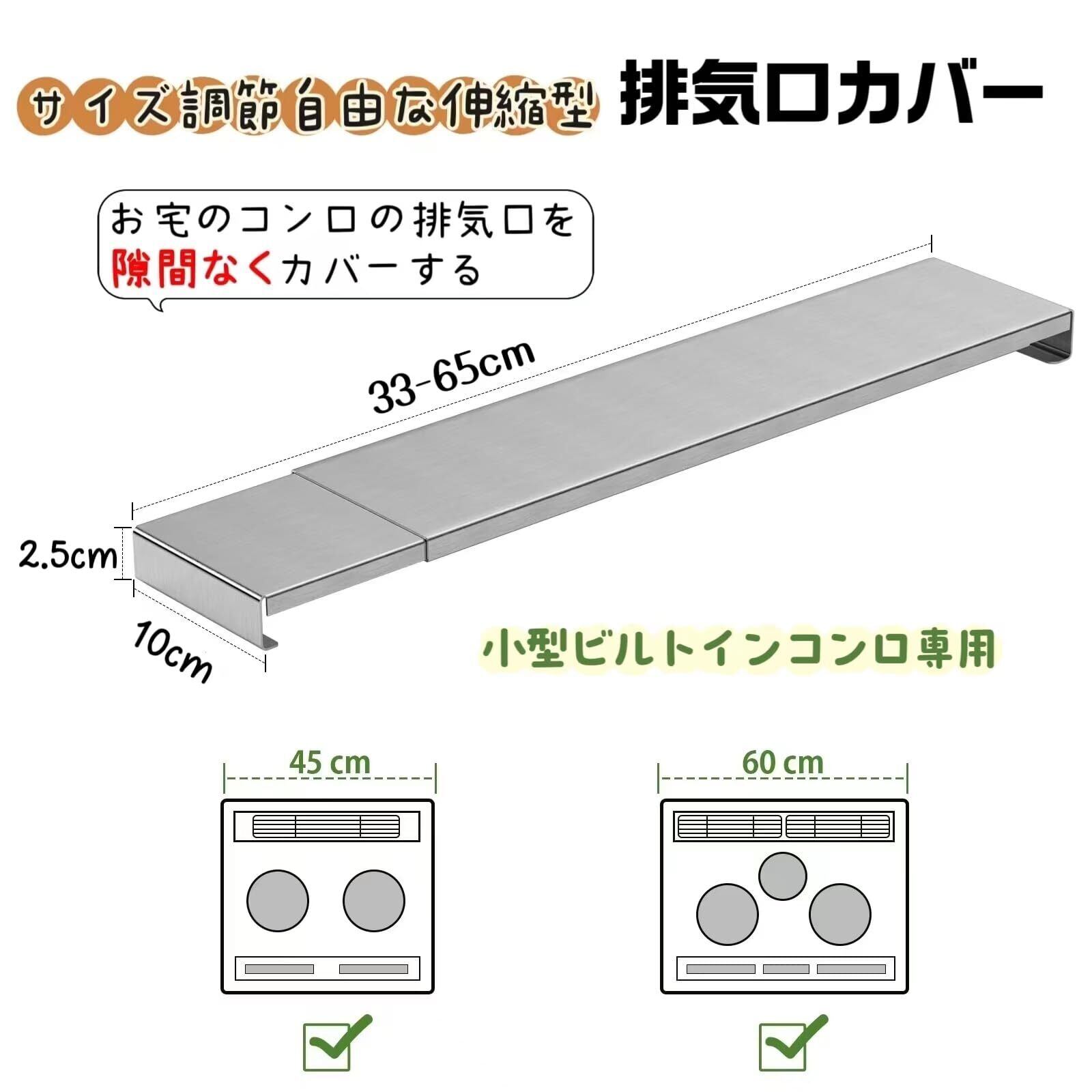【サイズ自由!伸縮式排気口カバー】 33センチから65センチまで自在に調節可能な伸縮式設計。ご自宅のコンロサイズにピッタリ合わせて、完全カスタマイズできます。IHクッキングヒーターとガスコンロの両方に対応し、幅広い環境でご活用いただけます。