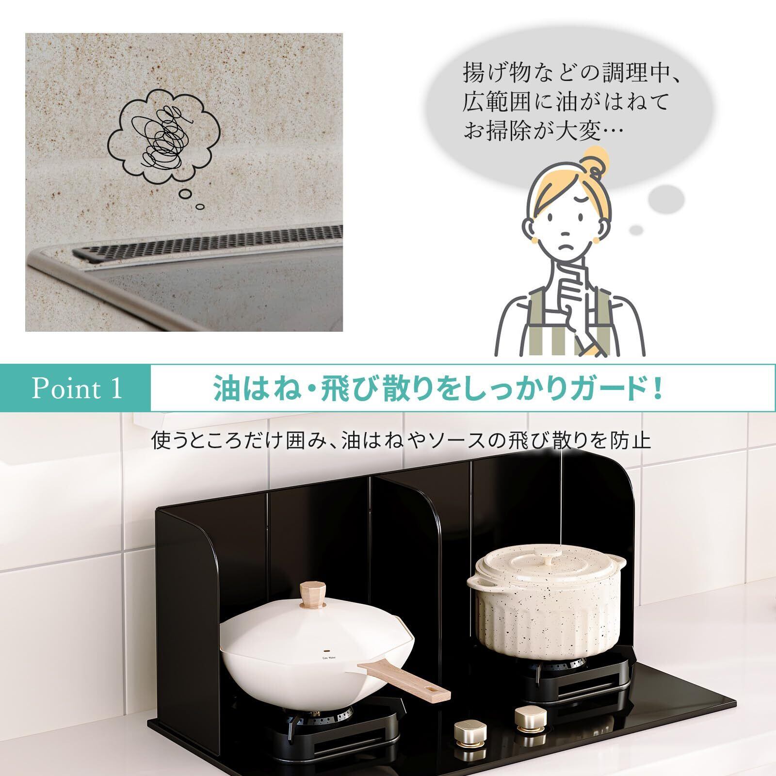 「油はね・飛び散りをしっかりガード」汚れが目立ちにくい黒色タイプ!ジャバラに折れる4面式は、調理スペースに合わせて囲み方を自由に変えられる!使うところだけ囲って、油ハネが広範囲に飛び散りにくい!