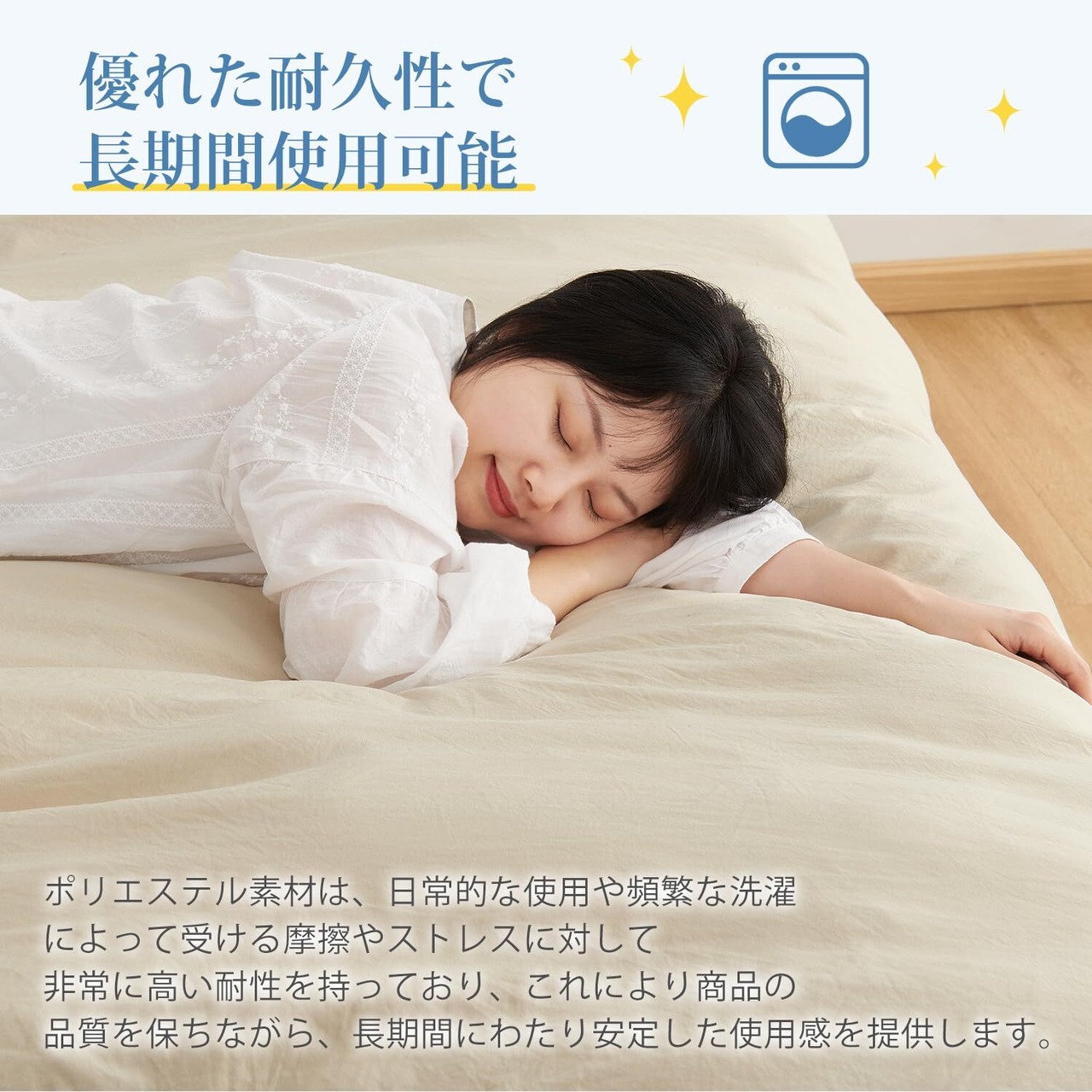 【商品情報】素材 -ポリエステル100%(ピーチスキン+洗いざらし) 仕様 -片側に全開ファスナー使用・布団留めひも8ヶ所付き 生産国 -中国