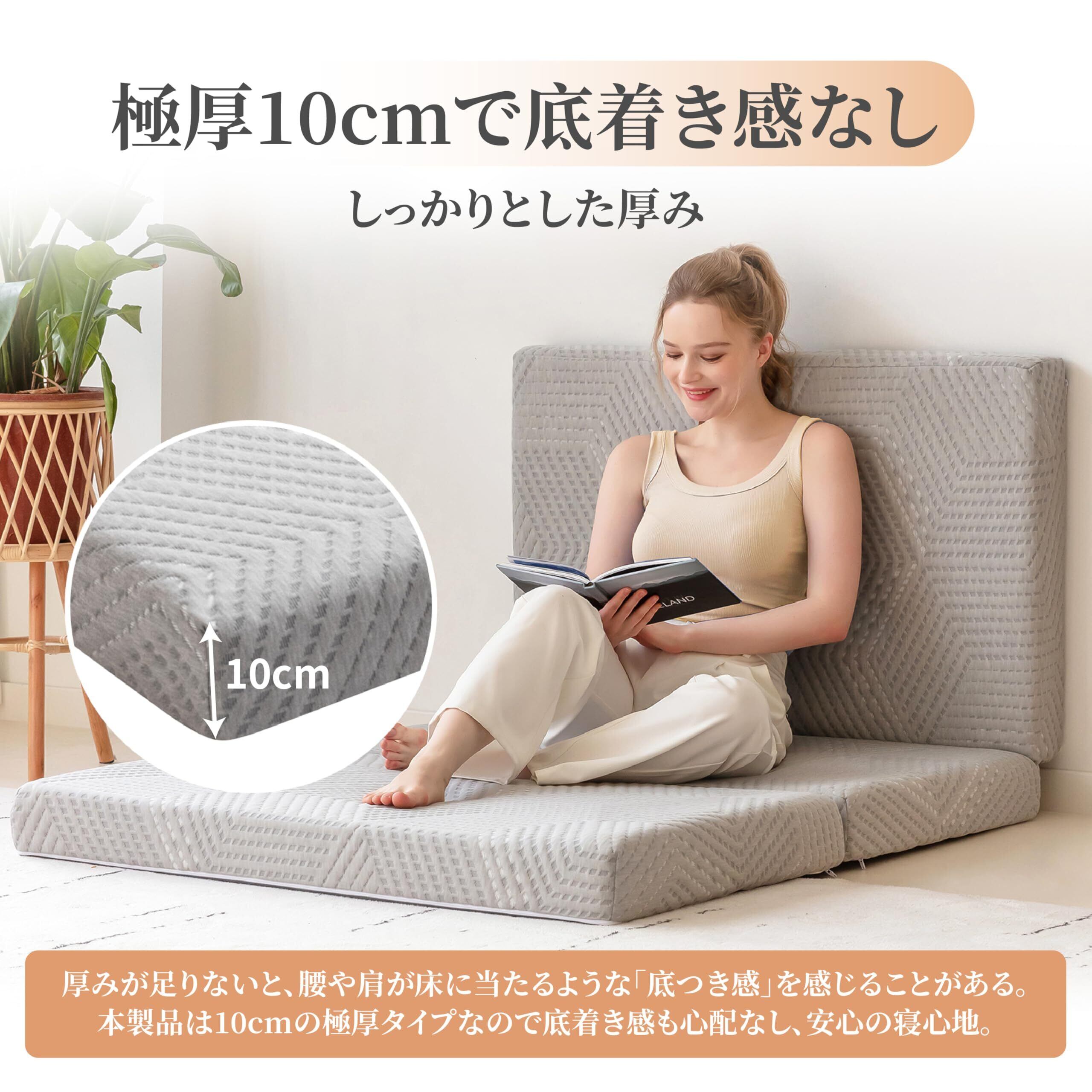 【便利な収納&収納袋付き】このマットレスは三つ折りデザインを採用しており、収納がとても便利です。使用しないときは、家の隅に整然と置いてスペースを節約できます。さらに、マットレスには便利な収納袋が付いているので、持ち運びや保管がより簡単に行えます。三つ折りデザインは、マットレスとしてだけでなく、簡易ソファとしても使えるため、非常に実用性が高いです。小さなスペースにもぴったりで、キャンプや車中泊、来客用布団、二段ベッドなど、さまざまなシーンで活躍します。