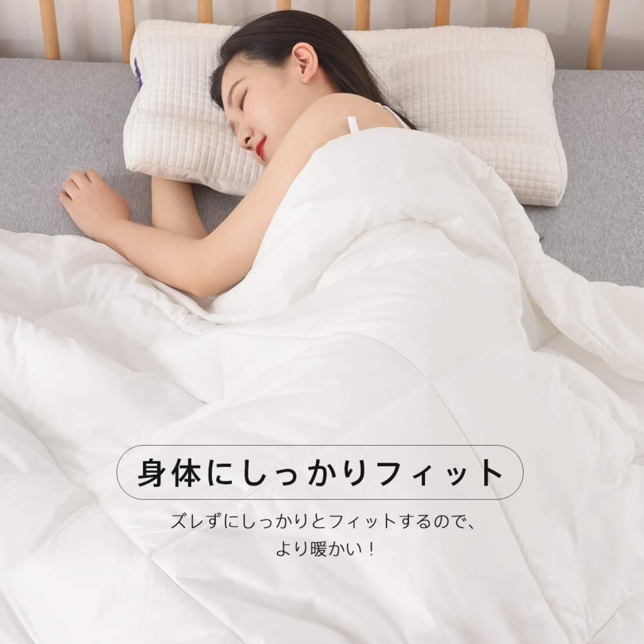 【商品情報】生地:ポリエステル(ピーチスキン加工) 中わた:ポリエステル(帝人「マイティトップII」を50%使用) 総重量:1.3kg 仕様:キルティング加工/6ヶ所紐通し付き 生産国:中国