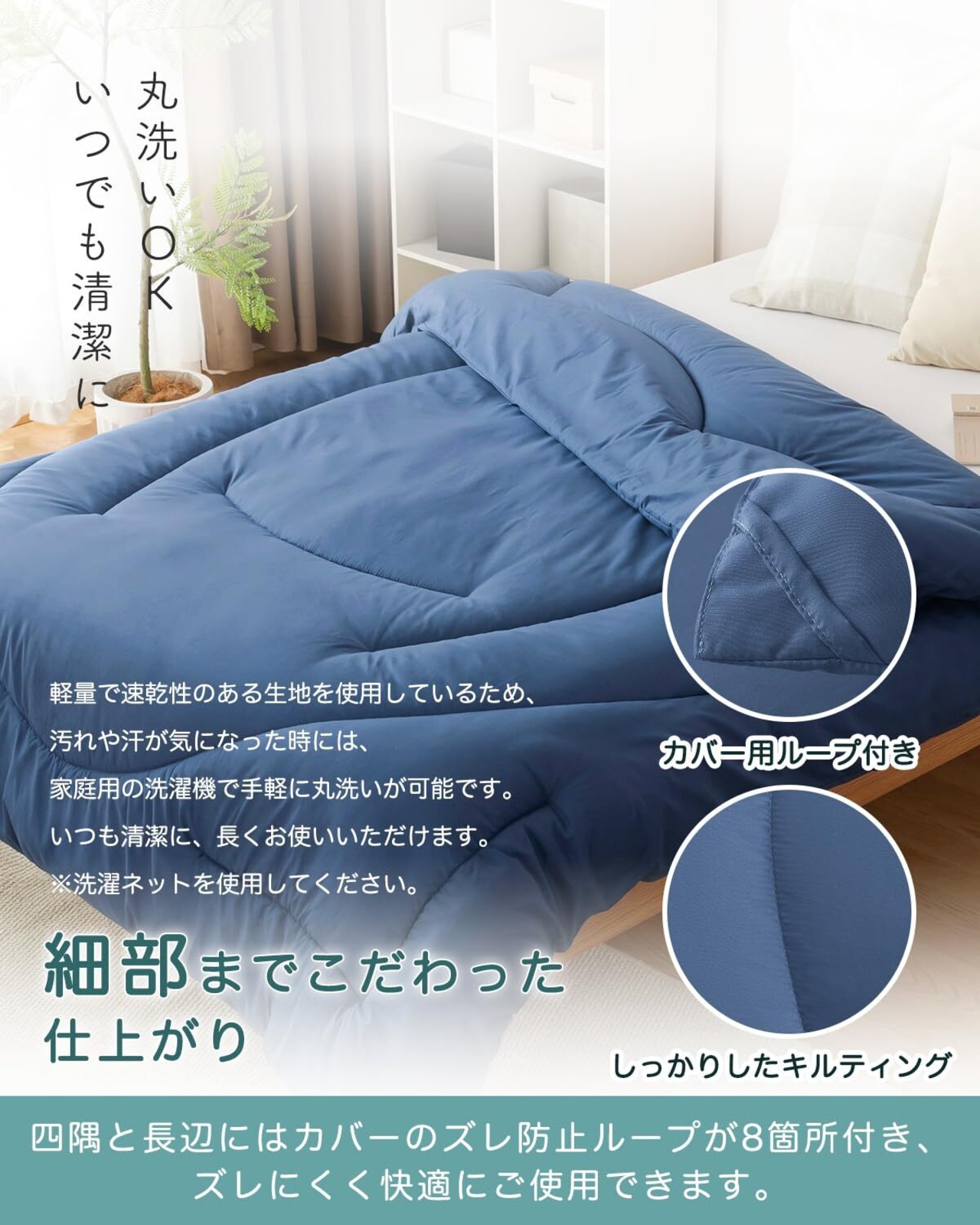 【オールシーズン掛け布団・商品仕様】「サイズ」シングル:150×210cm セミダブル:170×210cm ダブル:190×210cm ※キルティング製(許容範囲+5%,-3%)「側地」ポリエステル100% 「詰め物」中空ポリエステル綿100% 裏地:ポリエステル100%「ループ」S/SD:6ヶ所 D:8ヶ所 「企画国」日本【ご注意】お客様のご覧いただく環境により、色合いなどが異なる場合があります。実物とは色合いや明るさなどに相違が生じる可能性があるため、ご了承ください。万が一商品に不具合がある場合は、弊社にご連絡いただければ迅速に対応いたしますので、ご安心してお買い求めください。