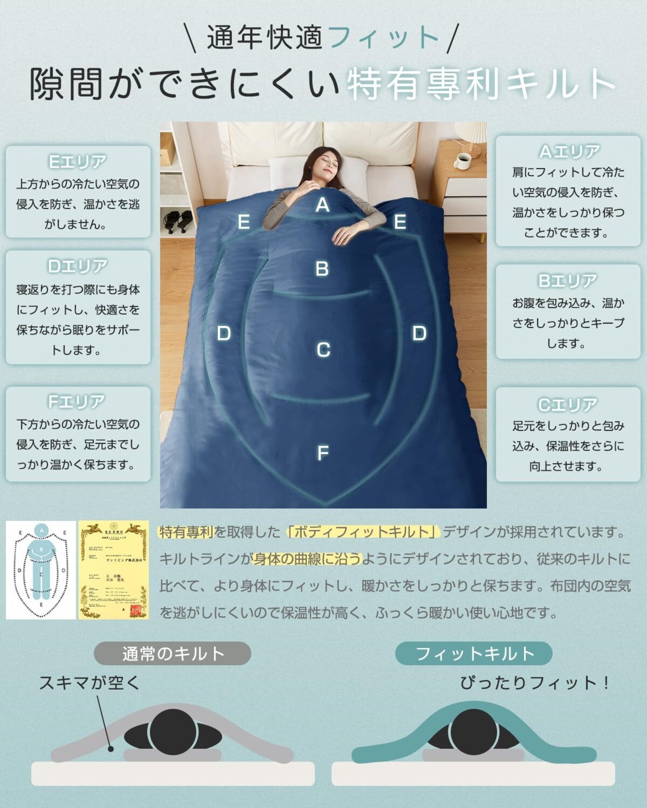 【体にフィットする・特有專利取得キルト】人間工学に基づいたキルトデザインで、従来のキルトよりもさらに身体にしっかりフィット!寝返りしてもズレにくく、ぴったりとフィットするため、暖かさをしっかりキープします。
