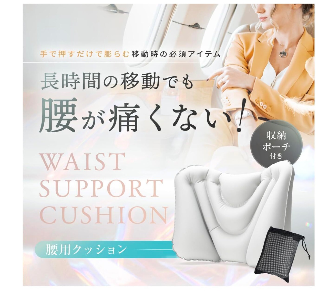 【【選ばれる理由】口を付けずに膨らむから衛生的。口紅を塗られる女性の方に特におすすめです!エアー式で軽量コンパクトに収納できます。旅行バッグやビジネスバッグの中に入れても邪魔になりません。人間工学に基づいた腰をしっかり包み込んでくれる形状が特徴です。
