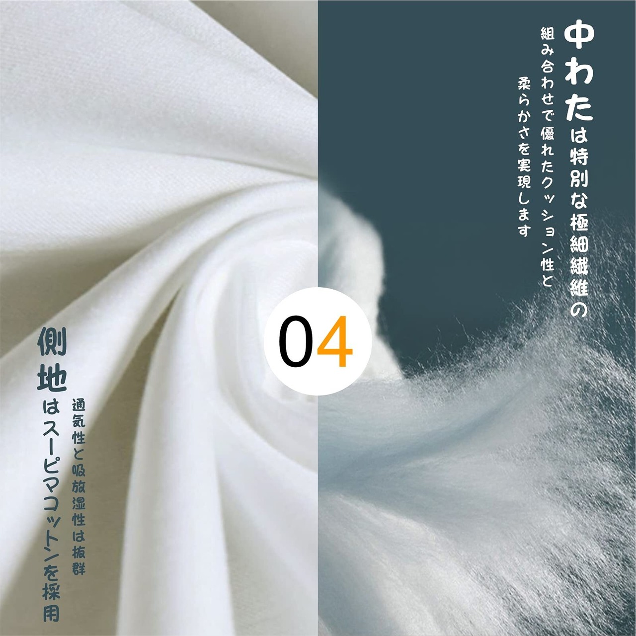 【抗菌防臭】側地は、汗や皮脂による细菌の繁殖を抑え、気になるニオイが発生しにくくなります。またダニも寄せ付けない加工も施している清潔仕様です。中綿は上質で通気性抜群のポリエステルを使用されておりますので、汗が本体まで染み込む状況を改善でき、長い時間使用しても寝心地良くお使いいただけます。抗菌・防臭・ 防ダニ で、肌に優しいだけでなく、健康も保証されます。