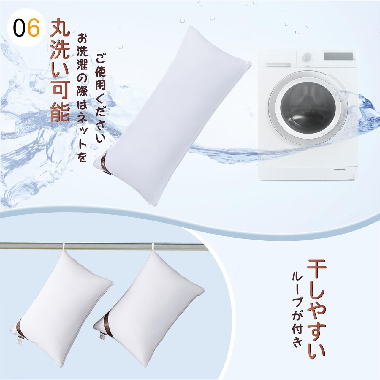 【洗える枕】家庭には丸洗いできます。枕が汚れた場合、直接枕本体(洗濯ネットに入れ)を洗濯機に入れて洗うこともできます。マチがついているので長時間使用しても変形しにくい。細かい点まで、ハンガーにかけるループ付き。枕ハンガー・まくら干し袋がないときでも、お洗濯後に物干し竿や物干しハンガーに簡単に干せます。