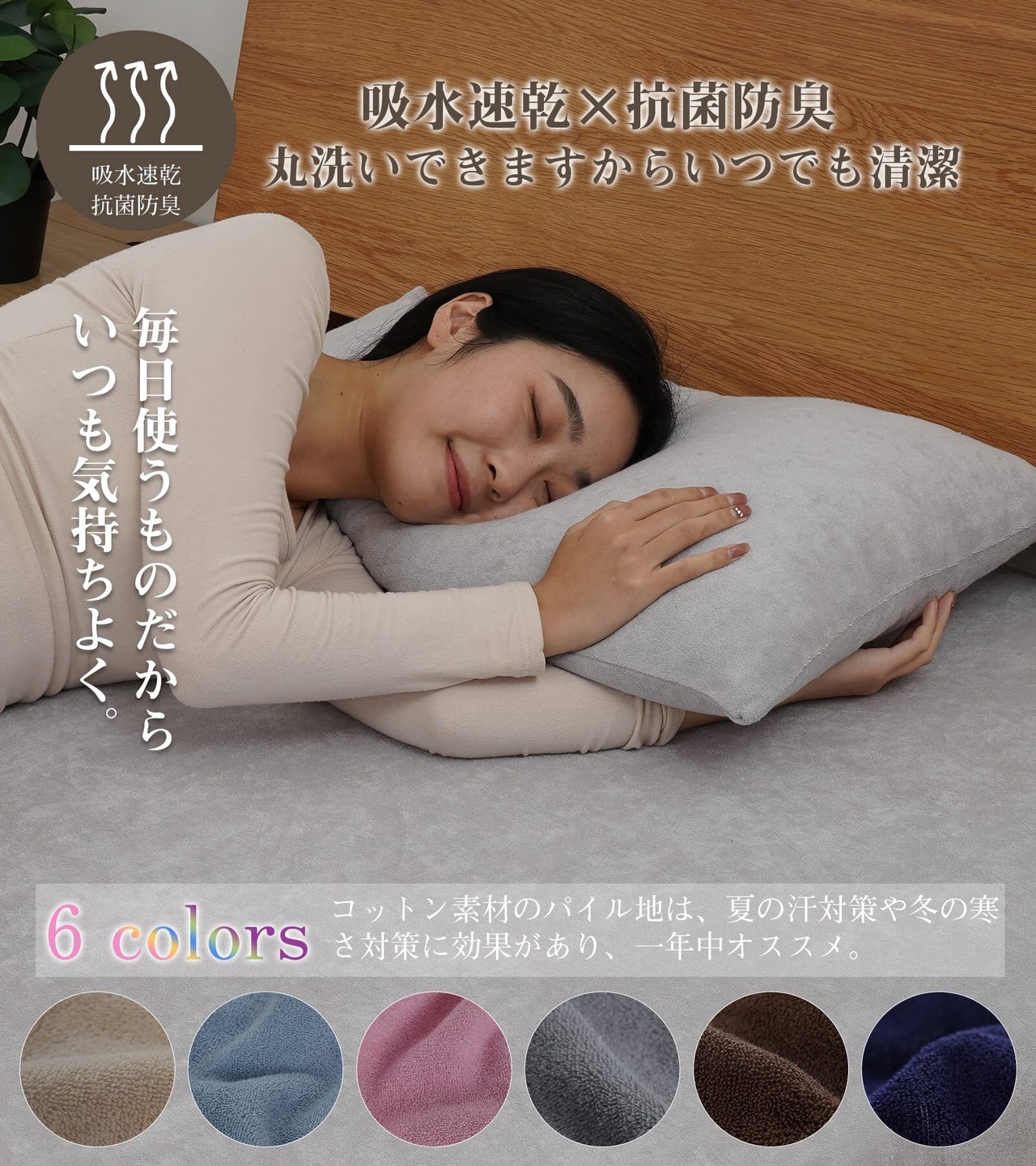 【抗菌防臭・オールシーズン使える】抗菌防臭加工で細菌の増殖を抑制し、防臭効果を発揮します。吸水性が高い枕カバーは寝汗素早く吸収し、サラサラカバーです。コットン素材のパイル地は、夏の汗対策や冬の寒さ対策に効果があり、一年中オススメ。