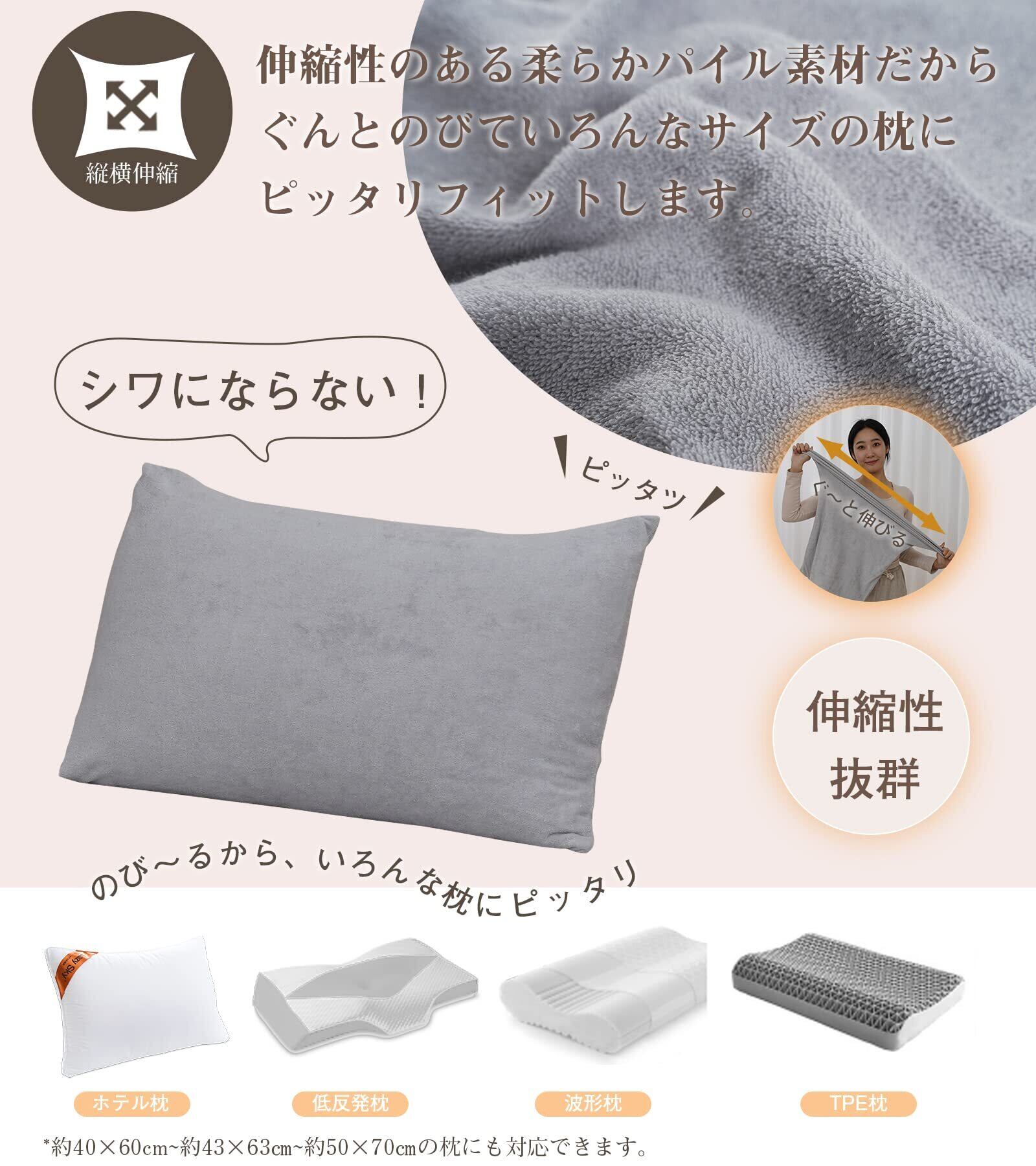 【のびのび素材であらゆる枕にフィット】:枕カバーの本体サイズ:約42×約62㎝。タテ・ヨコ自在にぐんぐん伸び、お使いのまくら(低反発枕、カーブ形状の枕、変形した形の枕など)をしっかりカバー。約40×60cm~約43×63㎝~約50×70㎝の枕にも対応できます。まくらカバーの素材:パイル部分:綿100%、グランド部分:ポリエステル95% ポリウレタン5%。