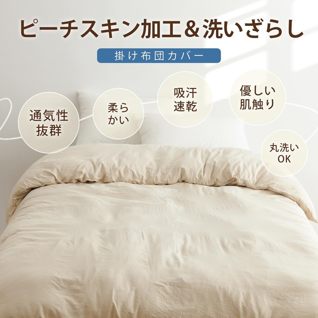 <商品情報>:サイズ-シングル・150X210cm 素材-ポリエステル100%(ピーチスキン+洗いざらし) 仕様 -片側に全開ファスナー使用・布団留めひも8ヶ所付き 生産国 -中国