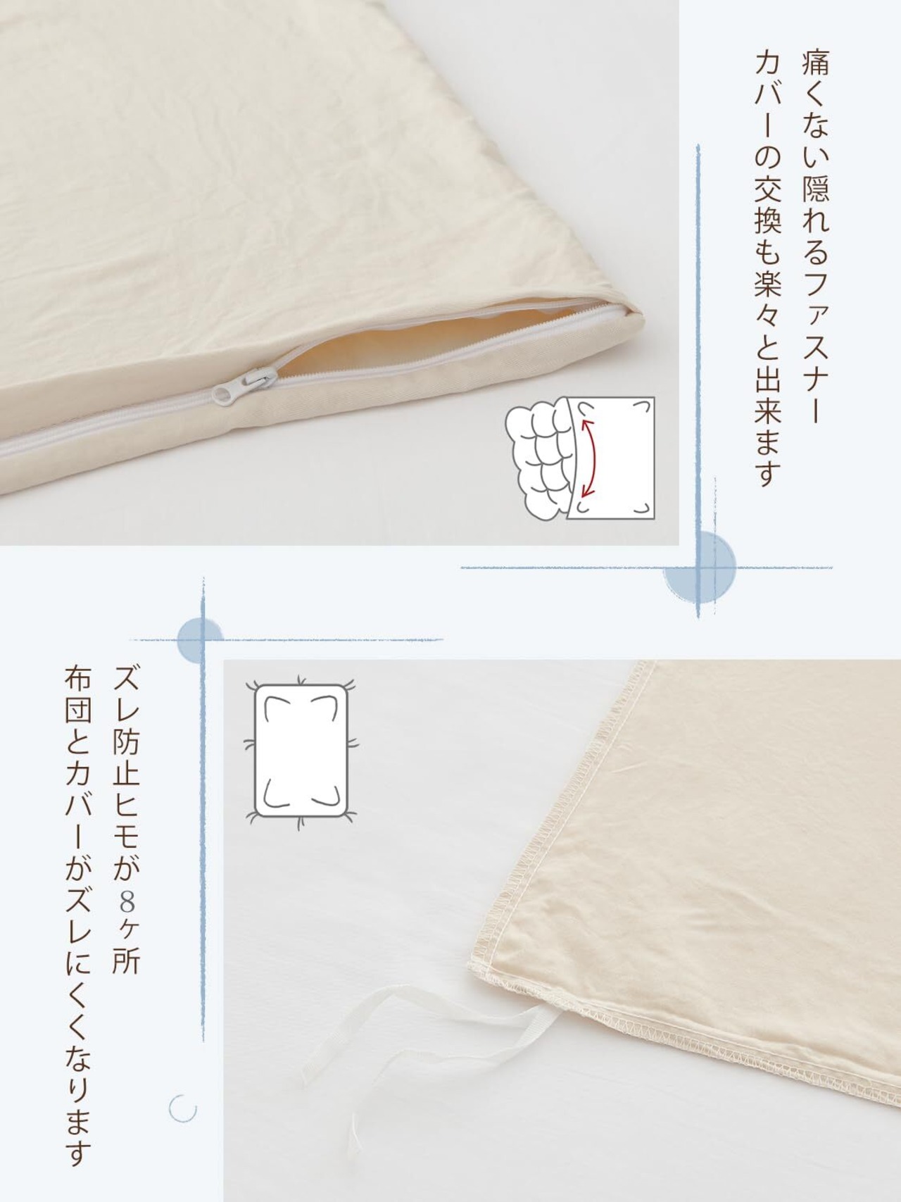 <洗濯機で丸洗いOK>:軽量で持ち運び易く、家庭用洗濯機での丸洗いが可能。速乾性に優れ、洗濯ネット使用でわたズレなし。常に清潔で、メンテナンスも簡単です。