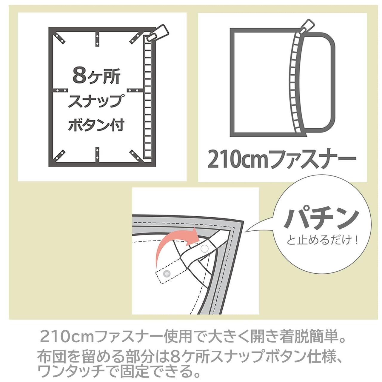 布団を留める部分は8ケ所スナップボタン仕様、ワンタッチで固定できる。210cmファスナー使用で大きく開き着脱簡単。