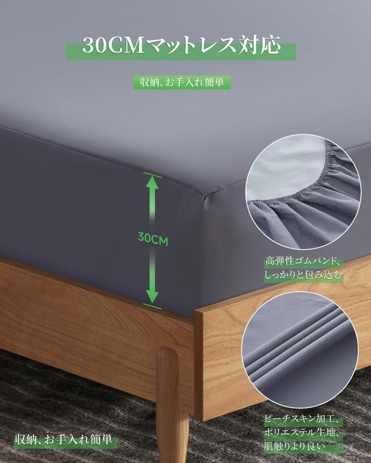 【3. 肌に優しいピーチスキン加工&耐久性抜群】ピーチスキン加工によるモモのようなサラサラとした肌触りが特徴で、触れるたびに快適さを実感できます。ポリエステル100%の高品質素材を使用し、縮みや型崩れが起きにくく、毛玉やシワもできにくい耐久性を実現しました。このシーツは長く使用でき、快適な睡眠環境を提供します。大人から子供まで幅広く使用可能です。