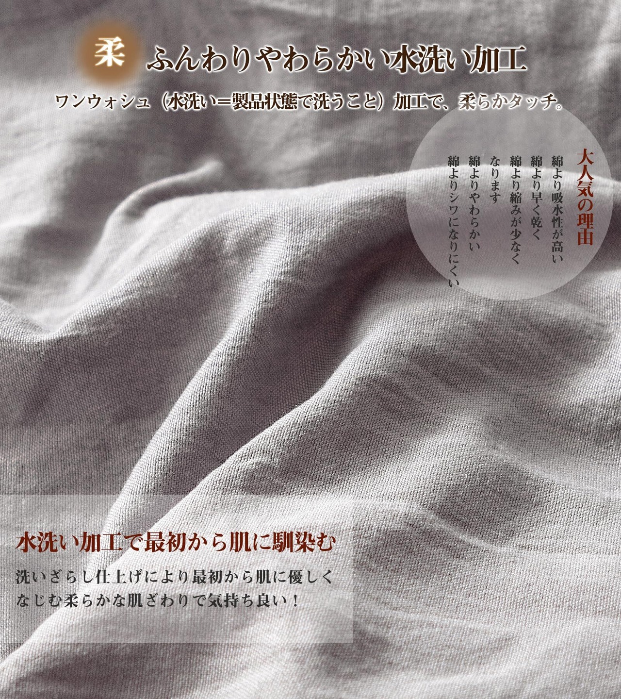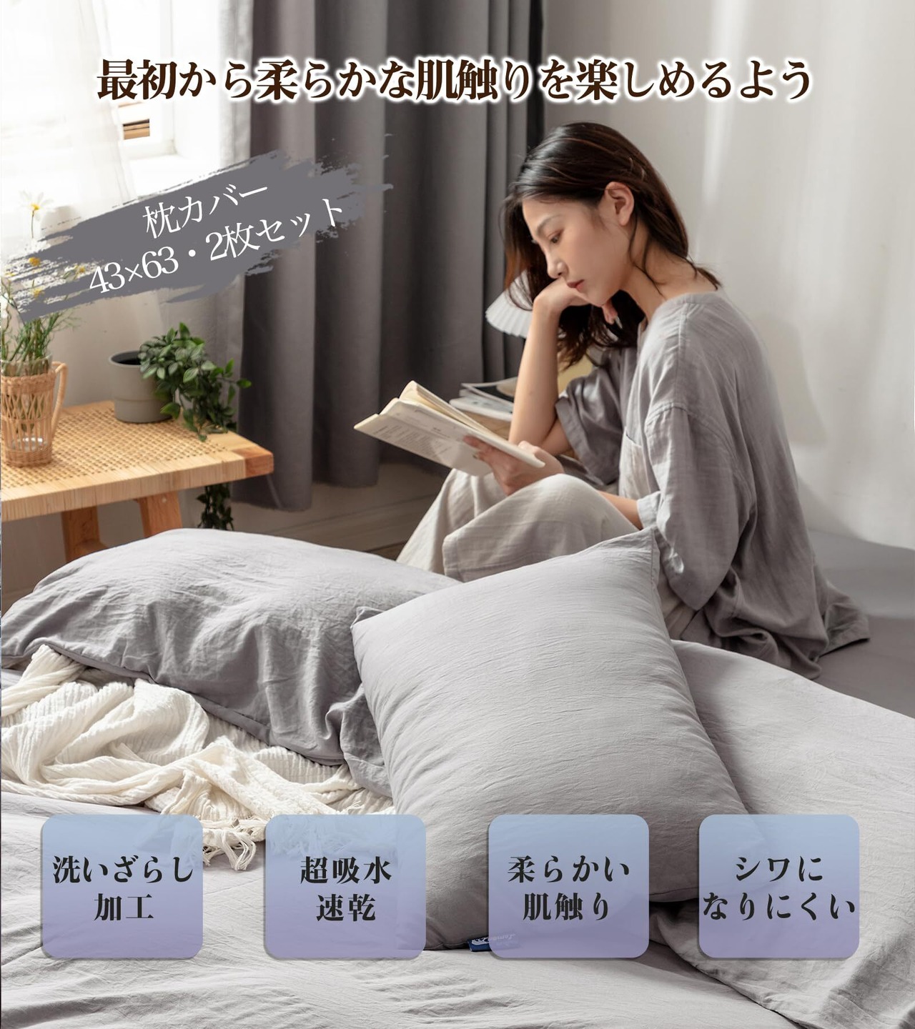 【水洗い加工まくらカバーの特徴】こだわり①「超吸水速乾 & 0秒吸水」まくらカバーは吸水速乾機能で汗をかいてもすぐに吸い取って乾きます。サラッとした肌触りでベタつきません。快適に眠ることができます。 こだわり②「優れた速乾性」水洗い加工のまくらカバーは速乾性に優れているので、湿気による細菌の増殖を抑えられます。夏は涼しく冬は暖か寝具で、オールシーズンに快眠環境を整えます。 こだわり③「通気性抜群&オールシーズン使える」水洗い加工で普通のピーチスキンピローケースと比べ、優れた吸湿性と通気性で、汗でもベタつかないサラサラ感を保ちます。ムレにくく、春夏秋はサラサラ、冬は暖かくて一年中快適にお休みいただけます。 丁寧に織り上げることにより、耐久性にも優れたしっかりとした生地に仕上がったピローケースです。 こだわり④「抗菌防臭」汗の量が多い方にもオススメな枕カバーです。良い抗菌防臭効果で細菌の増殖を抑制し、防臭効果を発揮します。毎日、素肌に触れるものだからこそ、抗菌防臭加工を施しています。お肌の敏感な方やお子様にもご安心に使用できます。