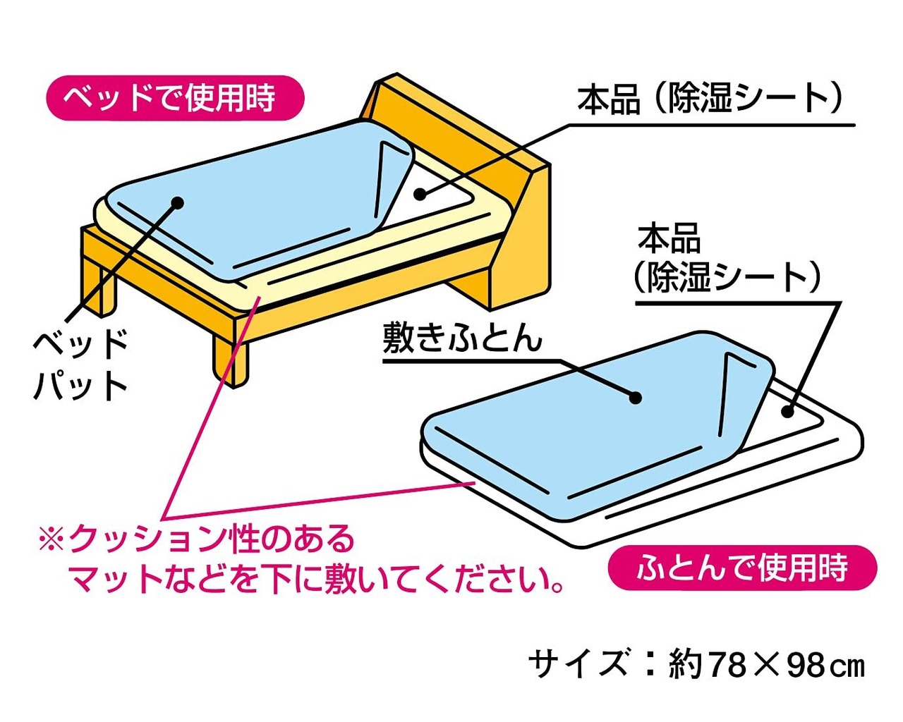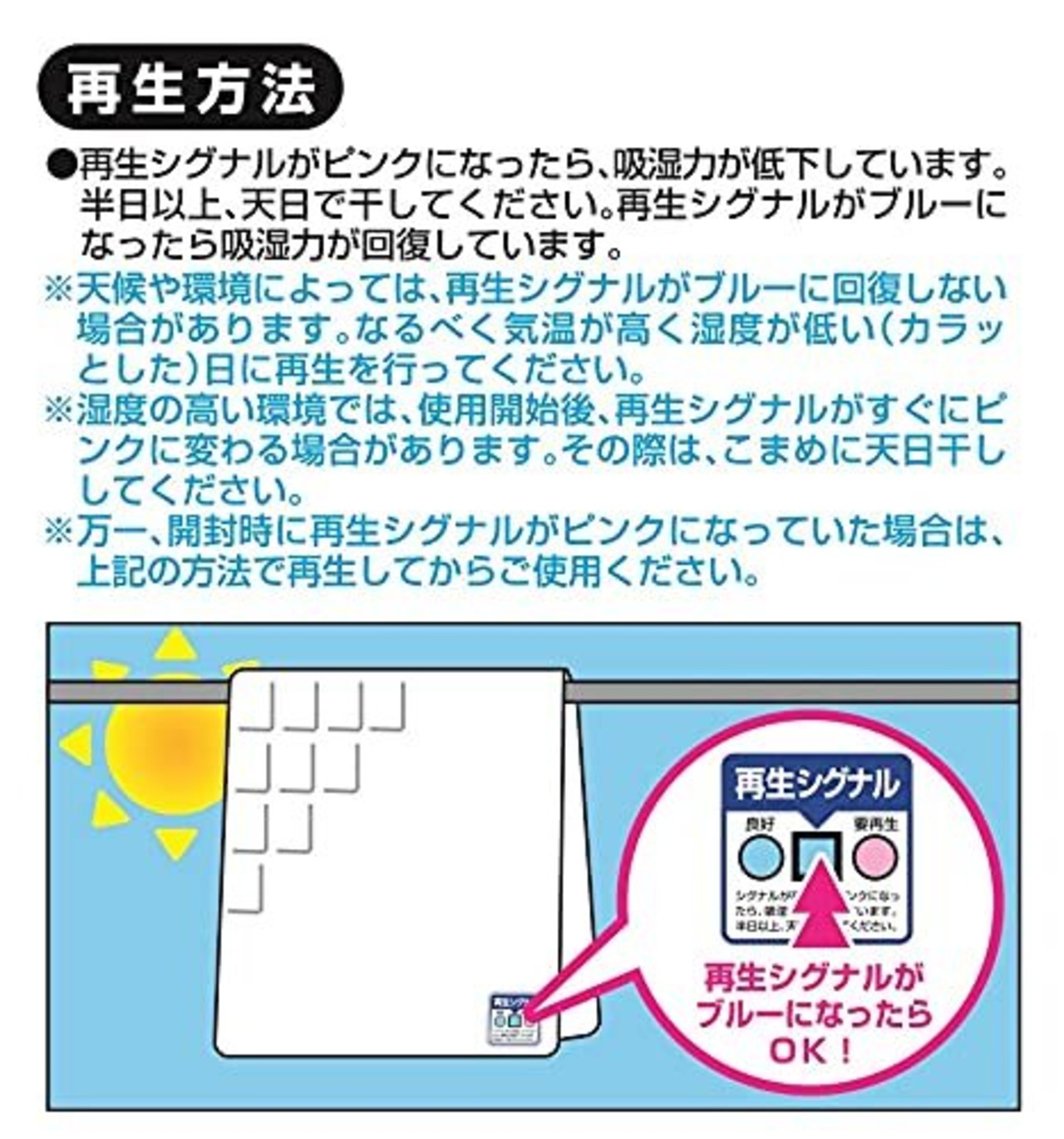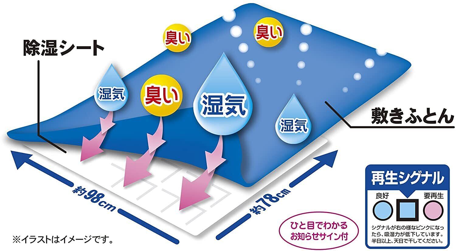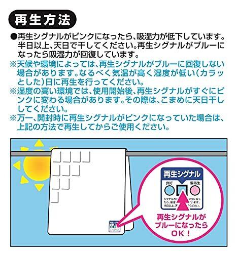 【ご使用方法】敷きふとん(ベッドの場合は敷きふとんまたはベッドパット)の下に敷いてお使いください。この時、比較的汗をかきやすい頭から腰の部分に敷くと効果的です。再生シグナルを上面にしてご使用ください。押入れやクローゼットの棚敷きなどにも使用できます。再生シグナルがピンクになったら、吸湿力が低下しています。半日以上、天日で干してください。再生シグナルがブルーになったら吸湿力が回復しています。※天候や環境によっては再生シグナルがブルーに回復しない場合があります。なるべく気温が高く湿度が低い(カラッとした)日に再生を行ってください。※湿度の高い環境では、使用開始後、再生シグナルがすぐにピンクに変わる場合があります。その際は、こまめに天日干ししてください。※万一、開封時に再生シグナルがピンクになっていた場合は、上記の方法で再生してからご使用ください。