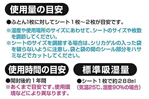 【使用量の目安】・使用量の目安:ふとん1枚に対してシート1~2枚が目安です。・使用期間の目安:開封後約1年間 ※使用環境などにより異なります。・標準吸湿量:シート1枚で約288mL(気温25度、湿度90%の場合)