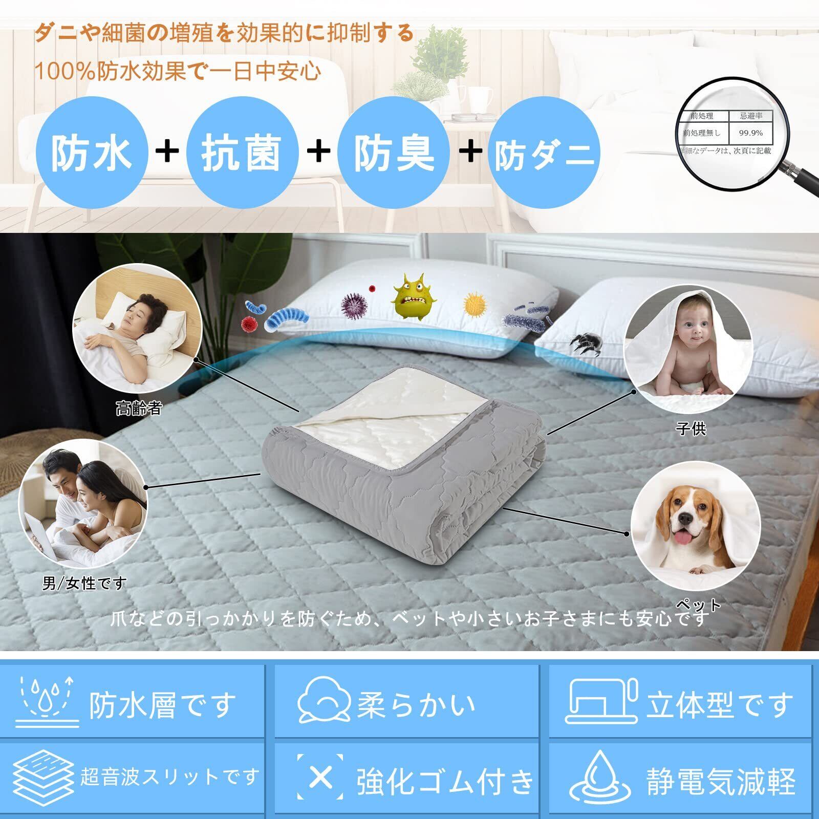 100% 防水加工素材:ベッドパッド 100%防水のため素材浸透しにくい 、表面の全体が防水仕様、敷きパッド裏面裏地TPUの防水加工生地がマットレスや敷布団を水分、汚れから守ります。マットレスを汚さないようにするのですという方にはおすすめです。