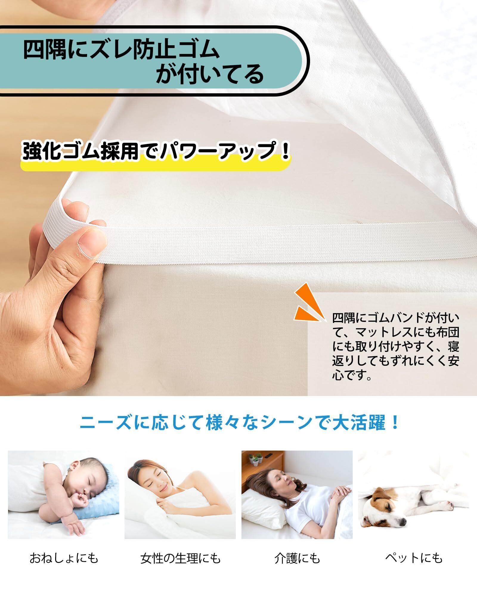 【ずれにくいデザイン】 防水敷きパッドの四隅に強化ゴムバンドを装備し、どんな動きにも対応。マットレスにぴったりと固定し、夜中のずれる心配を解消します。