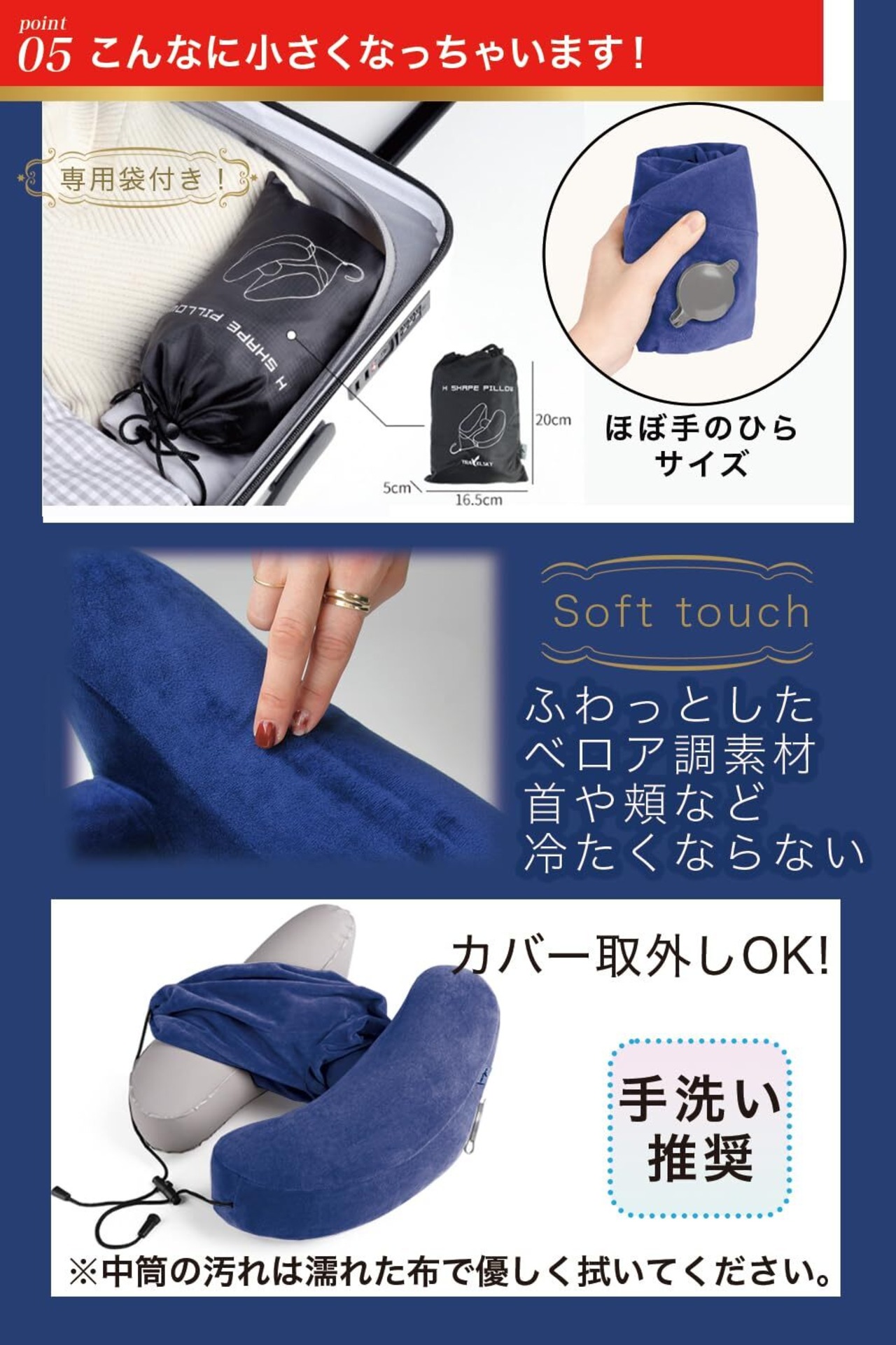 * 【理学療法士監修ネックピロー】筋肉や関節・身体機能の知識を持つ”理学療法士”が推奨するネックピローです。「形がH型であるため、首の後ろ側への負担軽減になりますね!」と手にとってお話ししてくださいました。アゴから耳うしろに向かって立ち上がる形状が、後頭部を支えて、長時間過ごせる自然なポジションにします。※窮屈に感じられる場合は、空気量で調整してください。長時間限られた姿勢で過ごさないといけない移動時に、首だけでなく「抱き枕」「腰用」など様々な使い方ができるのもポイントです。