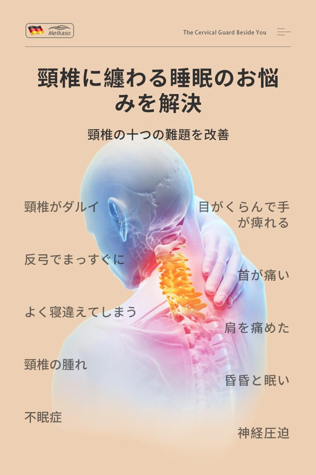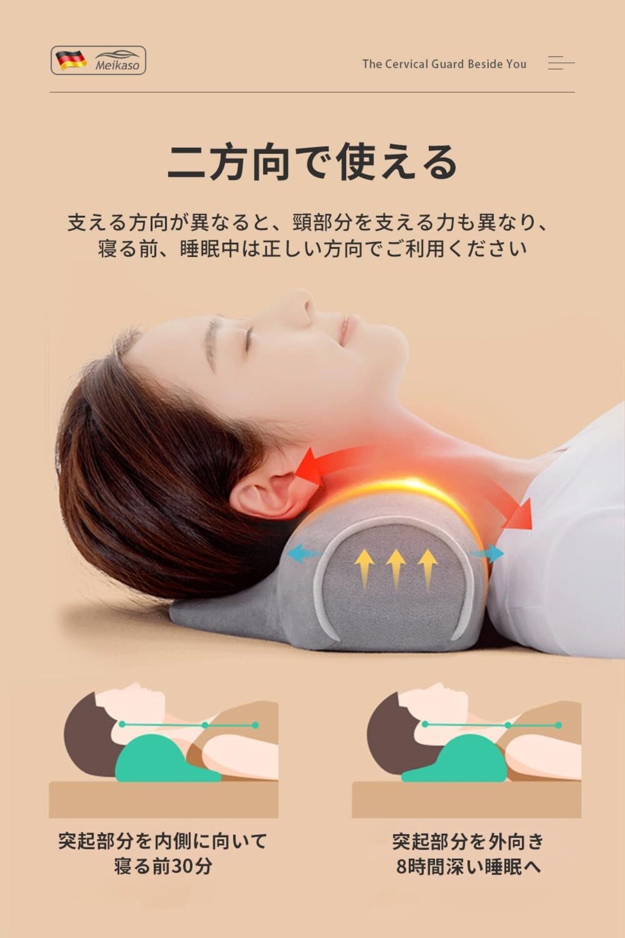 【二方向で使える】突起部分を内側に向いて 寝る前30分、頸椎の曲度をストレッチ、自然に頸椎をストレッチ、元の曲度へ回復、突起部分を外向き 8時間深い睡眠へ、軸方向ストレッチ、一晩8時間快眠、曲度改善。