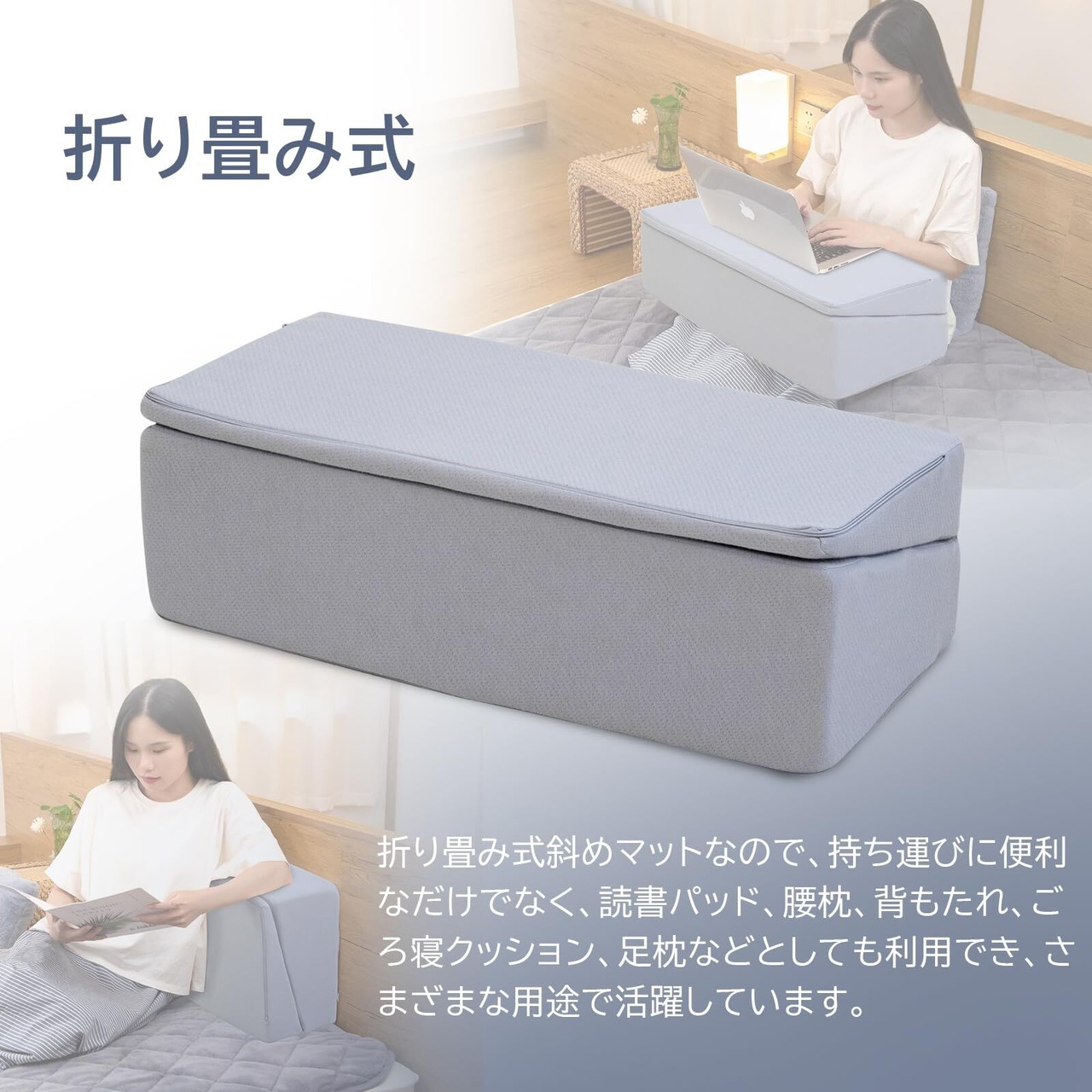 【工夫された設計】人間工学に基づいて設計された傾斜枕で、ちょうどいい角度、なだらかな角度(約17度)で背中を支えます。上半身の曲線に合わせて優しくサポートし、寝相を気にせずありのままの姿勢で安眠できます。なだらか枕として、背中への負担を軽減し、心地よい使用感を提供します。寝たり、うつ伏せしたり、もたせ掛けたりしたい時は活用できます。ベッド、床、ソファーでも楽利用できます。