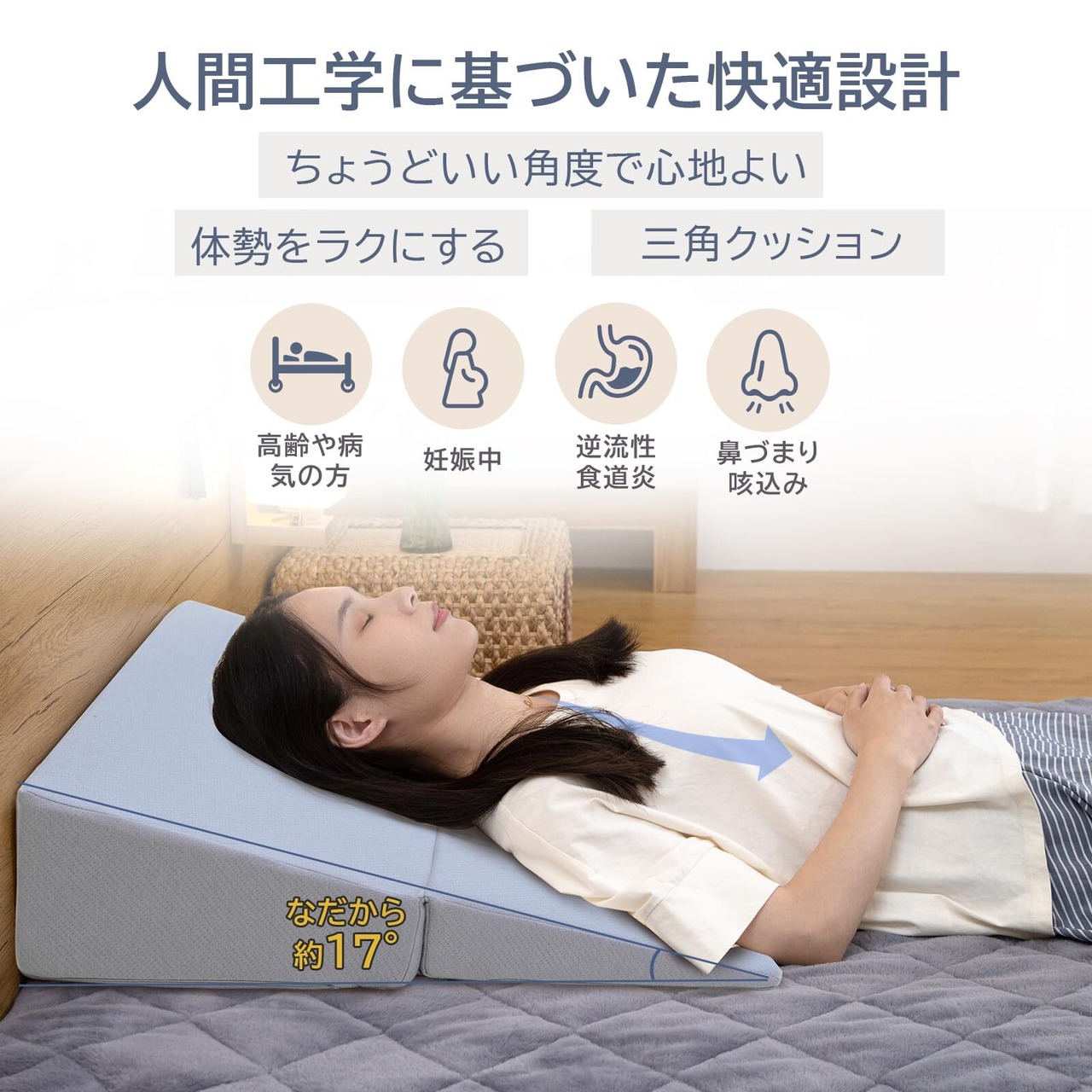 【適当な高さ&幅広く適用】胃酸の逆流を防ぐには、就寝時に背中を15cm-20cm上げて寝ると良いと言われています。こちらの三角枕は高すぎず低すぎず最適な17度で、仰向けでもうつ伏せでも最も快適です。縦置きと横置きの自由転換により、利用姿勢が豊富になり、足枕や腰枕、背もたれクッションなどとして、様々なシーンで使用できます。なだらかな傾斜、上半身を少し高め角度を付けて、胃の不快感を緩和、妊娠後期の胃圧軽減、呼吸は随分楽になり、楽に眠ることをサポート。