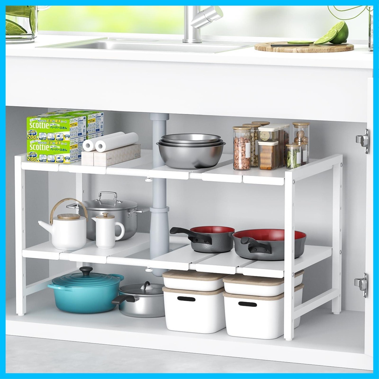 【おすすめのポイント】シンク下の整理に役立つ「収納アイテム」シンク下2段伸縮ラック!排水トラップを挟んで置けるデザインだから、キッチンのシンク下もすっきり整理できるんです。高さも幅も自由に調整できて無駄なくスッキリ!散らかりやすいシンク下もキレイに片付きます。鍋やフライパン、ボウルといった調理器具や、食品・洗剤のストック品、しょうゆやみりんなどの調味料など、キッチンのシンク下はさまざまな種類のモノがあふれる場所です。