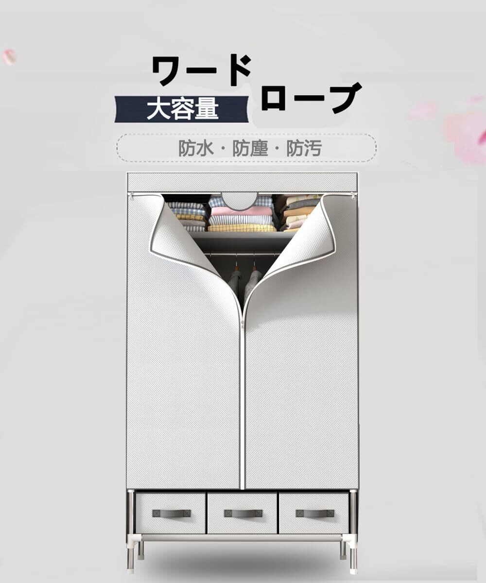 ワードローブ 3つの引き出し 大容量 クローゼット ハンガーラック カバー付き 衣類収納 不織布 工具不要 簡単組立式 防水 防塵 防汚 収納棚 幅90×奥行45×高さ170cm (ライトグレー)