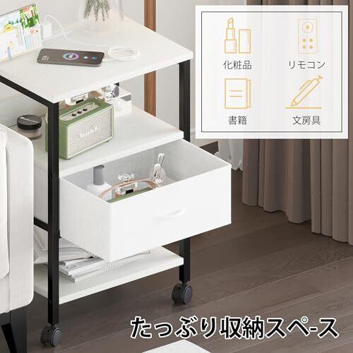 Fly-CTsoar サイドテーブル キャスター付き ナイトテーブル 引き出し付きのベッドサイド テーブル コンセント付き 可移動ナイトテーブル ベッド横 テーブル 北欧 洋服 タンス 天板付き (白, 幅40×奥行30×高さ63cm)