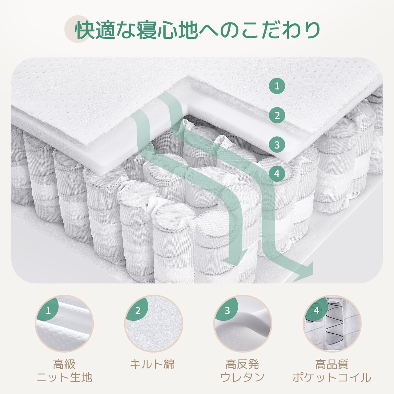 【高反発ウレタンクッション層】30D高密度ウレタンフォームを使用してクッション性を出せるので、ポケットコイルマットレス クイーンにも良い寝心地を保つてきます。さらにマットレスの表面は高級ニット生地を採用し、伸縮性に優れ、寝返りした時にもしっかりとフィットし、柔らかくて手触りがいいです。