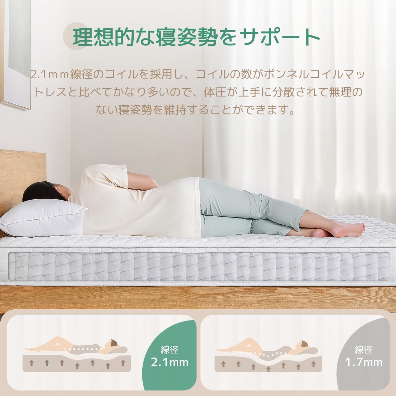 【理想的な寝姿勢を維持できる】ポケットコイルは体の圧力を支え、全身の重力を分散させ、首と腰の2か所に緩やかなS字カーブができる姿勢を維持することができます。どんな睡眠姿勢でも、体への負担が少なくなります。ポケットコイルマットレスは朝まで安心して睡眠をとることができます。