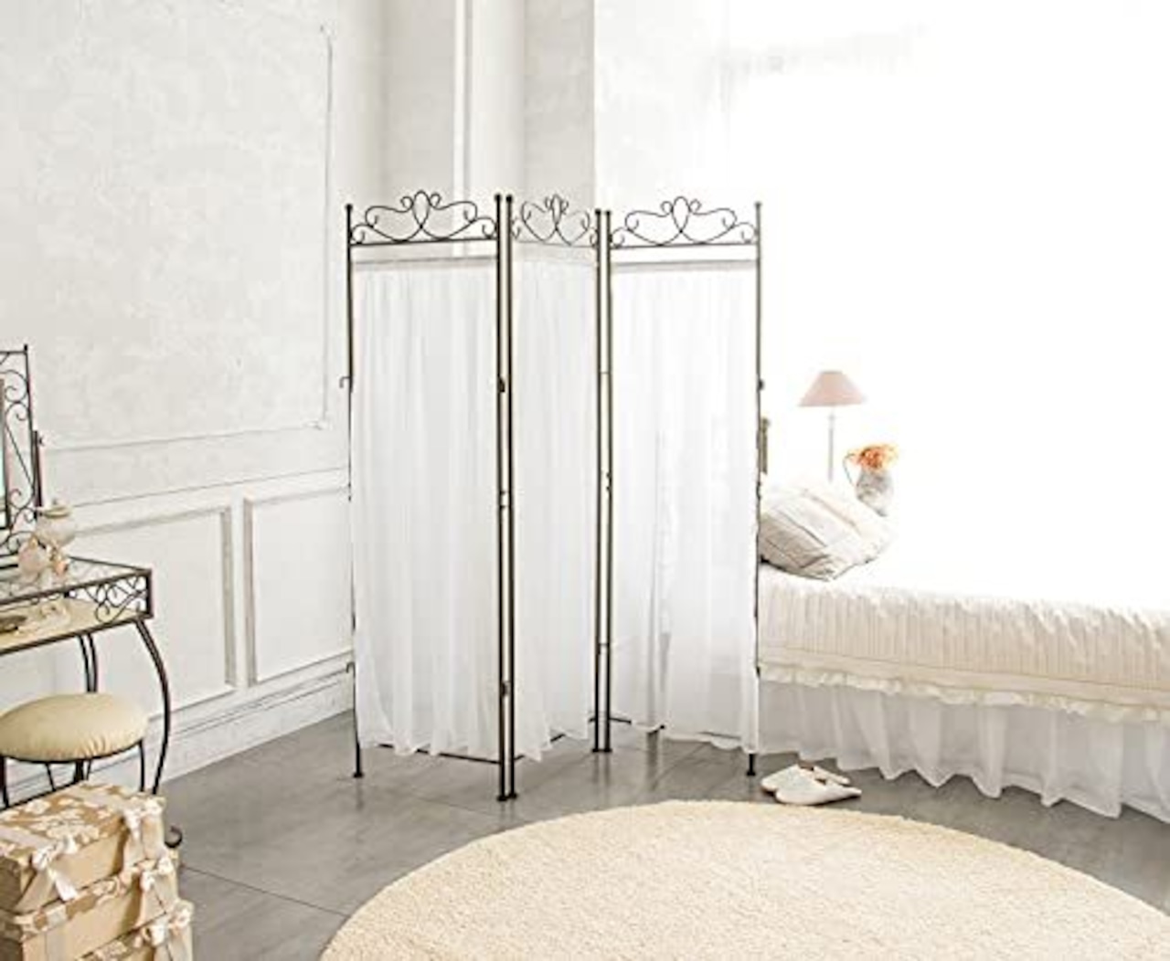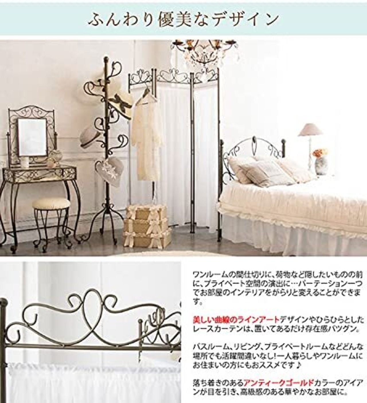 曲線をあしらった装飾の洗練されたデザイン、心地よさを醸し出すアンティークゴールドが人気の『Celestia(セレスティア)』シリーズの3連パーテーションです。優美なフレームデザインと軽やかになびくレースカーテンがノスタルジックな雰囲気を演出。ワンルームの間仕切りに、荷物など隠したいものの前に、プライベート空間の演出に…パーテーション一つでお部屋のインテリアをがらりと変えることができます。(a)