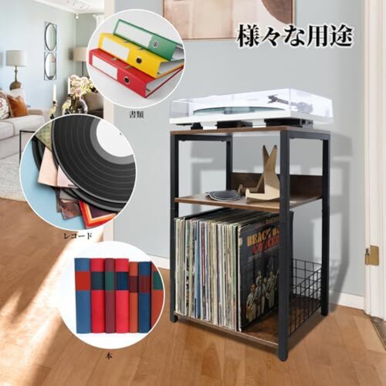 収納スペース:きちんと収納できる三層のスペースを備えており、整理整頓が簡単です。底部は3つの区画に分かれており、アクセサリー、約60~70枚のレコードや小物もすっきりと収めることができ、使い勝手の良さを実感できます。
