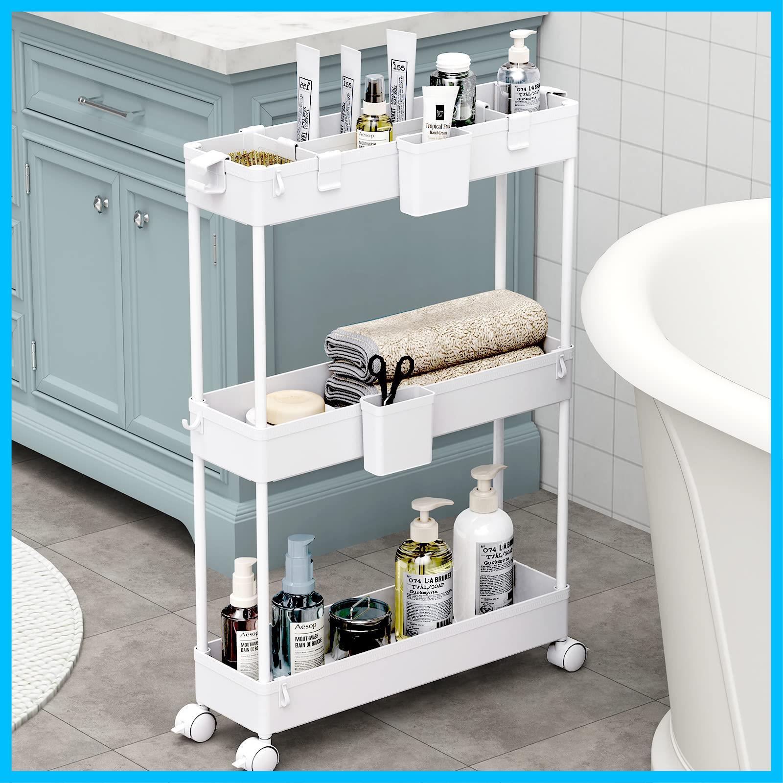 【特価セール】SPACEKEEPER キッチンワゴン 隙間収納 スリム 13cm 収納カップ 仕切板付き 多機能 小物 食品 調味料 キャスター付き 組立簡単 浴室 台所 冷蔵庫横 3段 ホワイト